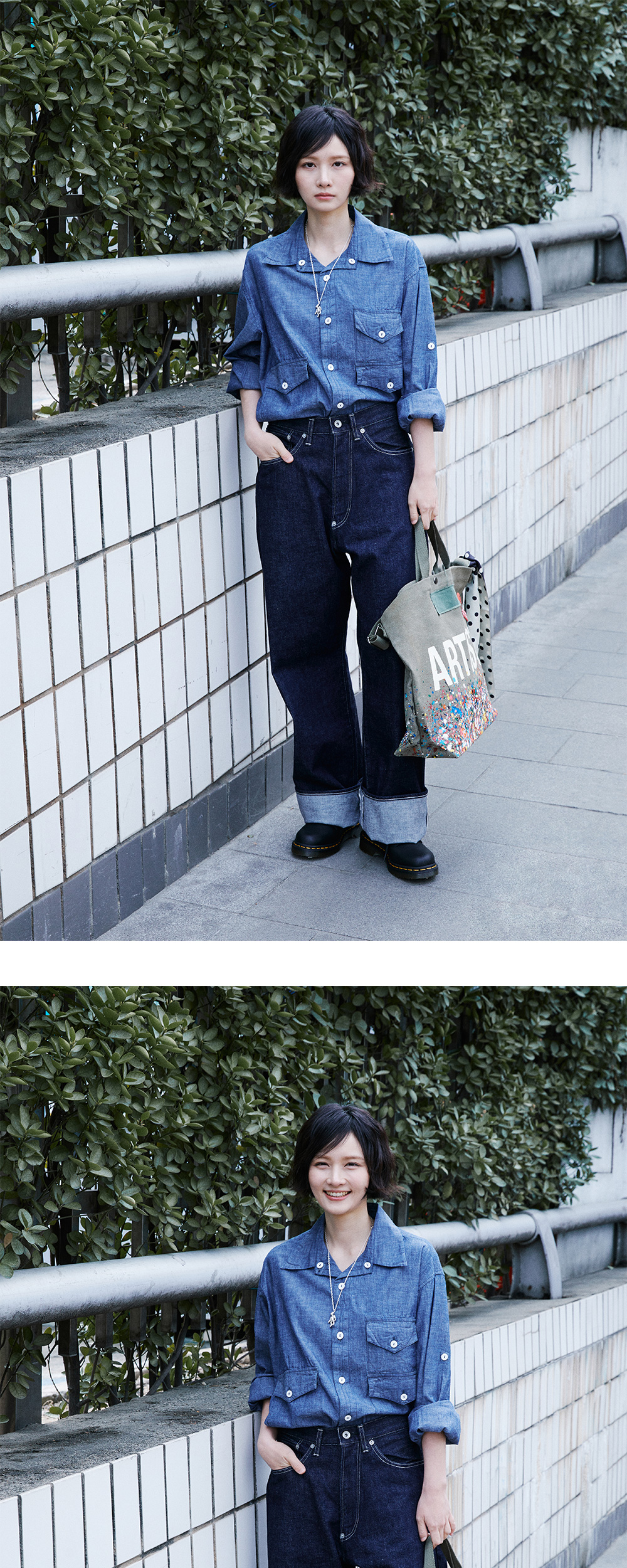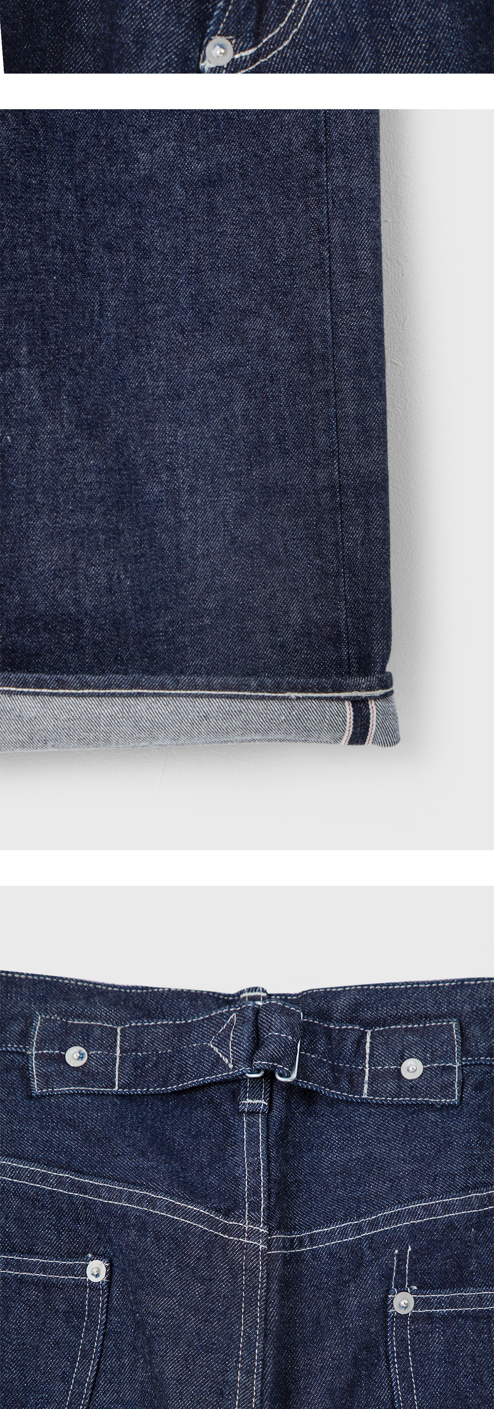 일본 데님의 본고장 오카야마 코지마에서 생산된 OFS의 셀비지 데님을 소개합니다. - 오카야마 코지마 Yard 아뜰리에 셀비지 데님 사용 - 적당한 두께의 13.5o로 사계절 높은 활용도 - 화이트 스티치 - 신치백 디테일