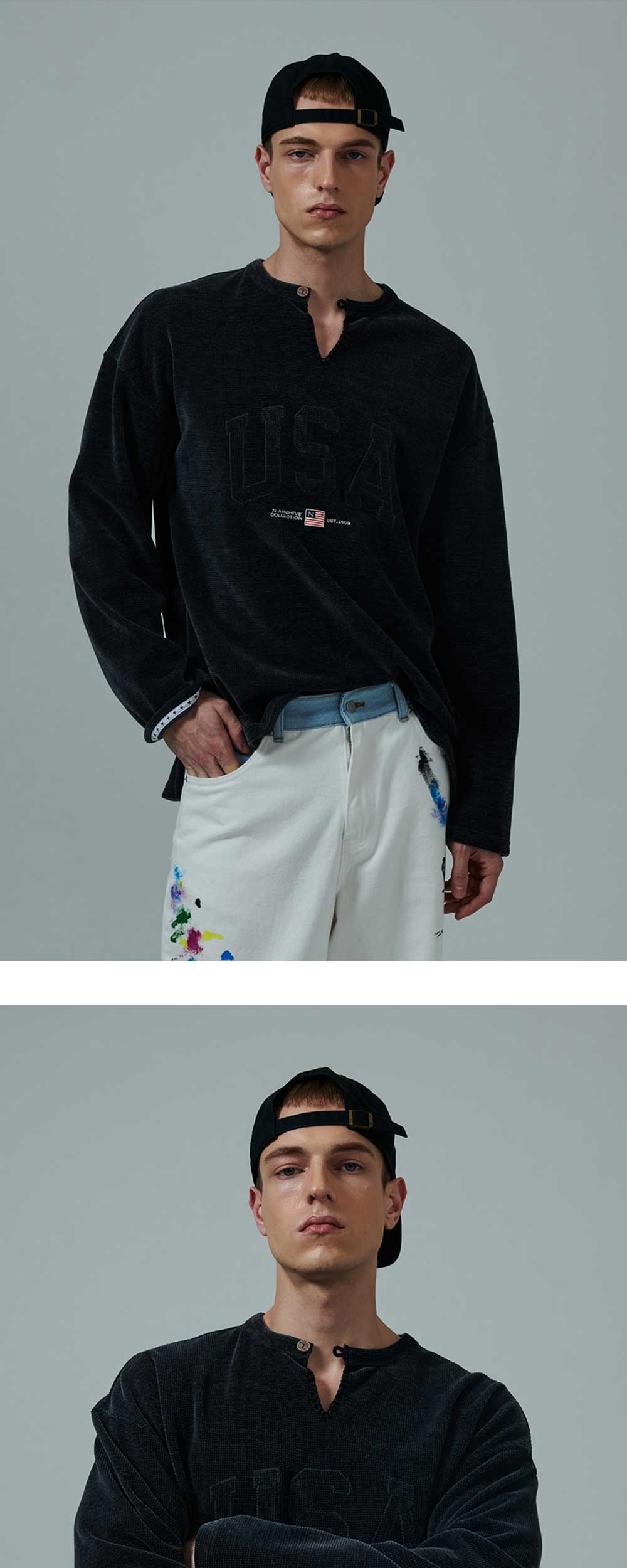 ㆍ컬렉션 라인의 90년대 빈티지 티셔츠에서 영감을 받아 제작된 롱 슬리브 헨리넥 티셔츠 ㆍ넥 라인에 빈티지 버튼으로 포인트 ㆍ가공된 와플 조직의 원단을 사용하여 빈티지 무드를 더함 ㆍ90년대 방식으로 직조된 원단을 사용해 오리지널리티의 복각 ㆍ아플리케 핸드 스티치와 자수 기법을 더한 디테일 ㆍ남녀공용 착용