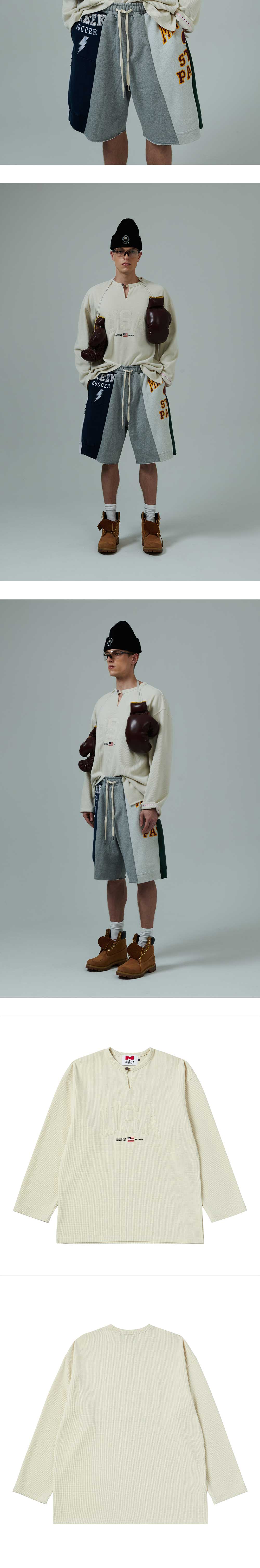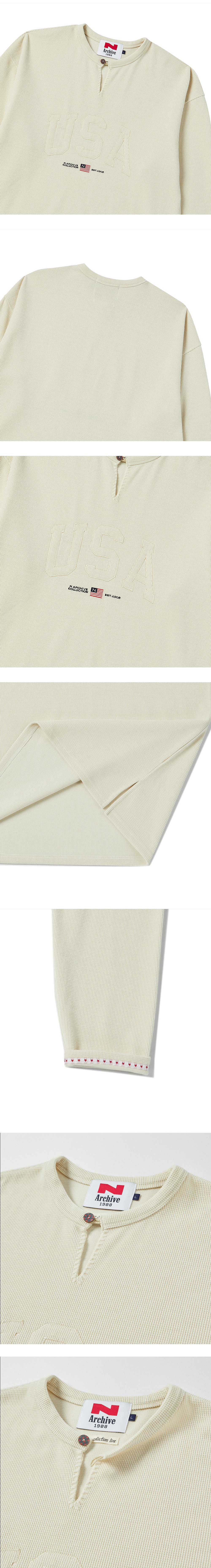 ㆍ컬렉션 라인의 90년대 빈티지 티셔츠에서 영감을 받아 제작된 롱 슬리브 헨리넥 티셔츠 ㆍ넥 라인에 빈티지 버튼으로 포인트 ㆍ가공된 와플 조직의 원단을 사용하여 빈티지 무드를 더함 ㆍ90년대 방식으로 직조된 원단을 사용해 오리지널리티의 복각 ㆍ아플리케 핸드 스티치와 자수 기법을 더한 디테일 ㆍ남녀공용 착용