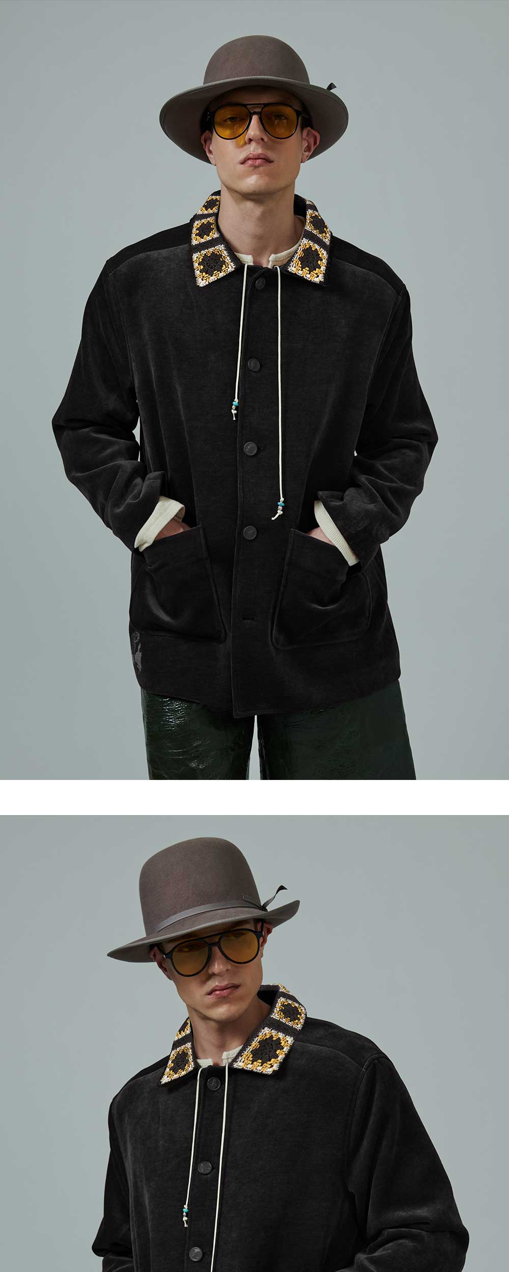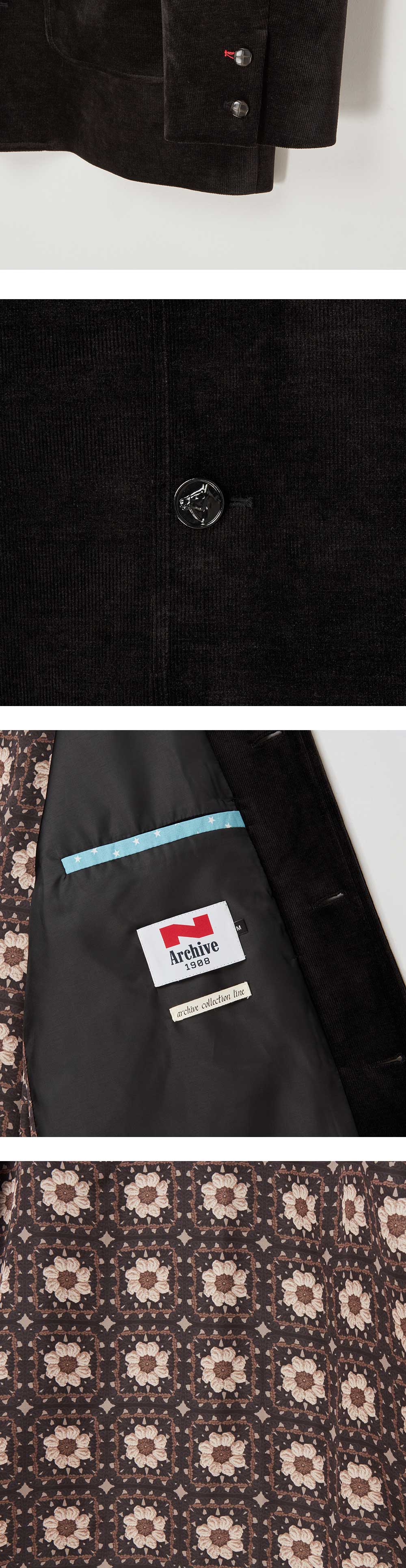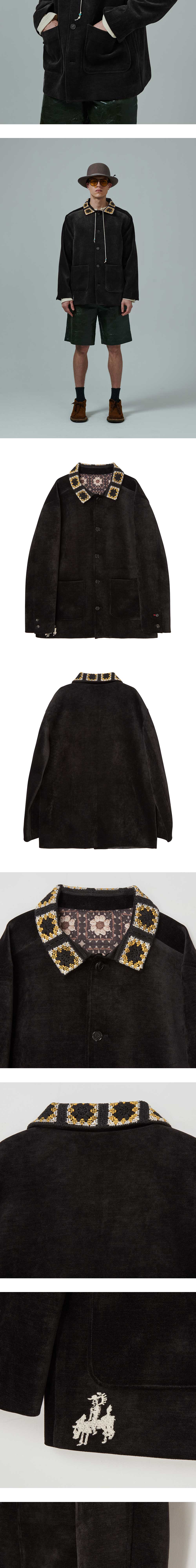 ㆍ 아카이브 라인의 셔닐 혼방 소재로 제작된 빈티지 아트 피스 자켓 ㆍ90년대 방식으로 제작된 테일러링을 통해 오리지널리티를 복각 ㆍ송충이를 의미하는 셔닐 단어 뜻처럼 대단히 부드러운 외관으로 완성되며 착용감이 우수 ㆍ가죽 위에 특수 공법으로 표현된 HORSE BUTTON(MADE IN ITALY) ㆍ빈티지 크로셰 원단으로 포인트를 더한 카라와 포켓 하단부 자수 디테일 ㆍ빈티지 원단으로 포인트를 더한 안주머니 디테일 ㆍ소매 리얼 버튼 ㆍ남녀공용 착용