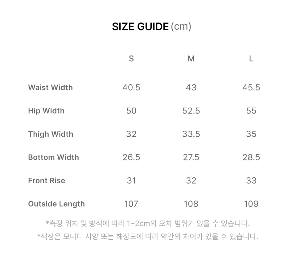 | 총장 | 허리단면 | 힙단면 | 허벅지단면 | 밑단 | 밑위 |