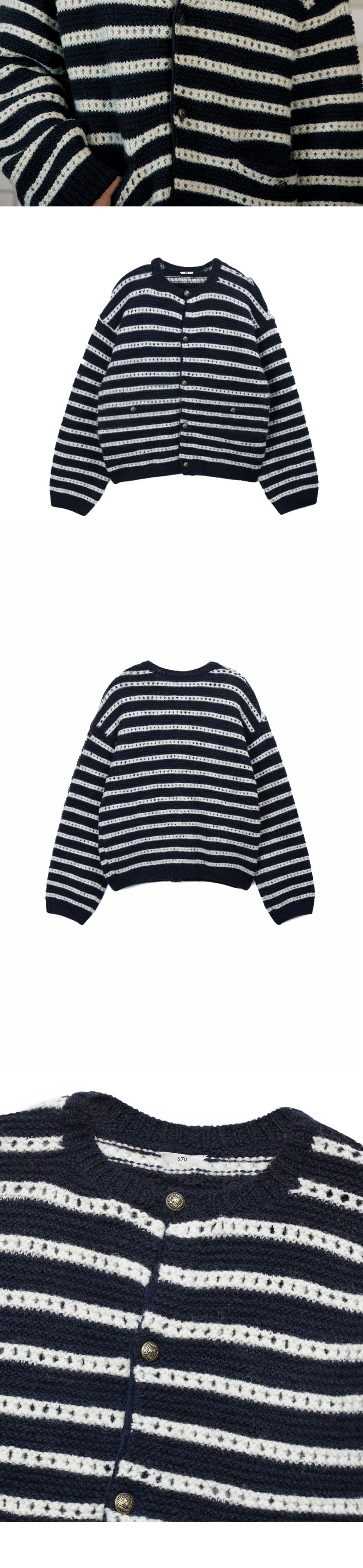 [KREAM 단독 리오더/더블적립] 에스티유 라운드 넥 스트라이프 가디건 네이비
