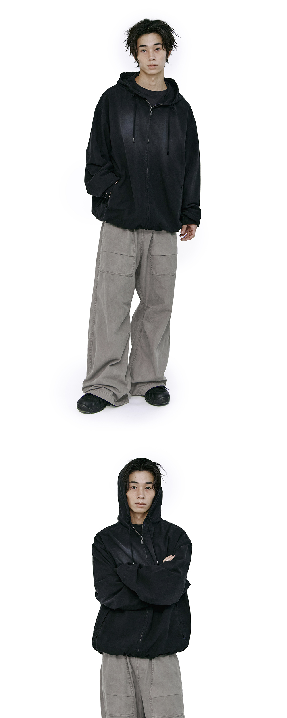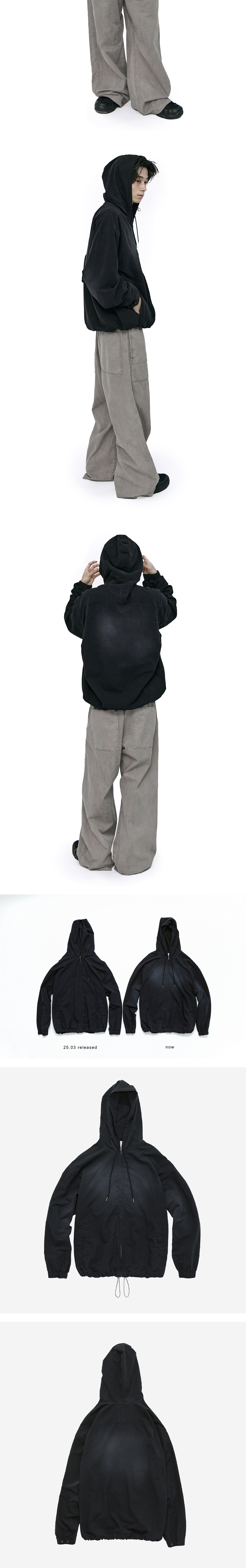 zip hoodie parka - faded ink - 심플한 구성의 집 파카 - 얕은 크리즈드 질감의 코튼 베이스 - 부드럽게 뭉개지는 실루엣 - 전체적으로 넓은 품, 긴 기장 구성 - 적당히 깊은 후드 사이즈 - 아우터 볼륨에 전혀 영향을 주지 않는 부드러운 소재감 - 밑단 스트링으로 실루엣 조절 가능 *모델: 175cm / 마른 체형, 3사이즈 착용 *디자인 의도에 맞게 착용하시려면 기존 폴리테루 제품과 동일한 사이즈를 선택하시는 것을 권장드립니다. *일반 체형 기준 - 170cm 초반 이하 2사이즈 권장 - 170cm 중반 3사이즈 권장 - 170cm 후반~180cm 초반 4사이즈 권장 *직전 차수 대비, 금번 차수는 조금 더 어두운 톤으로 완성됐습니다.