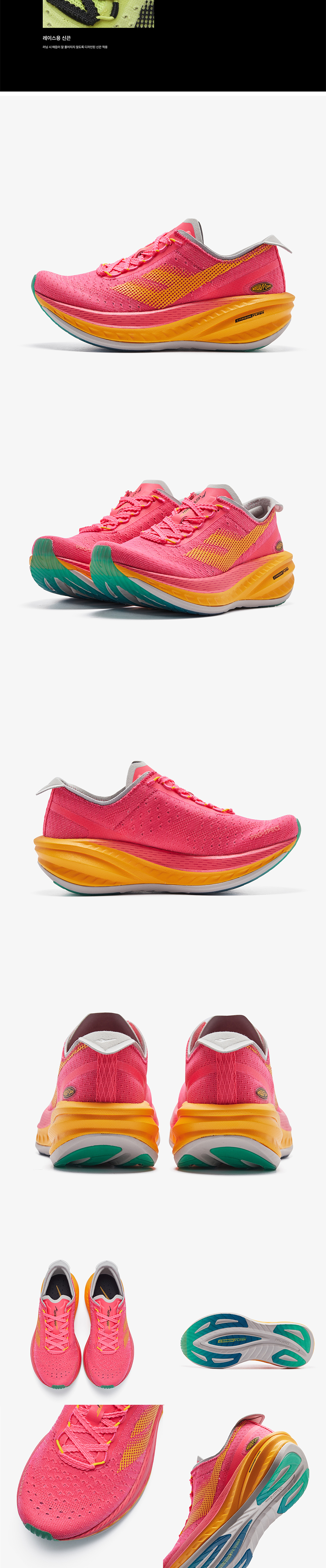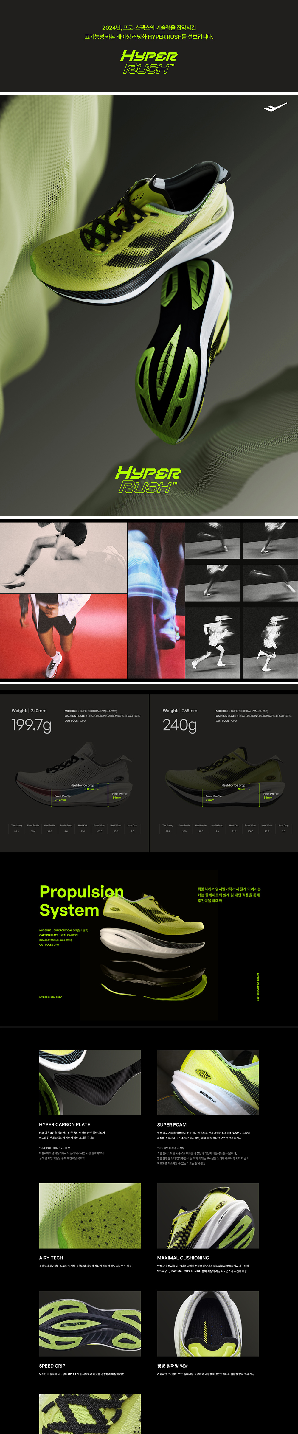 HYPER CARBON FLASH : 탄소 섬유를 적층하여 만든 카본 플레이트가 미드솔 중간에 삽입되어 에너지 리턴 효과를 극대화함 SUPER FOAM : 발포 기술을 활용하여 신규 개발한 가볍고 탄력이 우수한 미드솔 물성을 적용하여 최상의 쿠셔닝을 제공함 힐드랍 9mm / MAXIMAL CUSHIONING : 안정적인 접지를 위한 더욱 넓어진 전족부 바닥면, 높은 추진력과 자연스러운 미드풋을 위한 앞꿈치에서 뒷꿈치까지의 드랍차 9mm, 맥시멀 쿠셔닝 폼이 최상의 러닝 퍼포먼스와 추진력을 가능케함 AIRY TECH : 가벼운 원사를 사용하여 경량성이 우수하며 홀이 큰 메쉬 구조로 러닝시 발생하는 열기 배출에 용이함