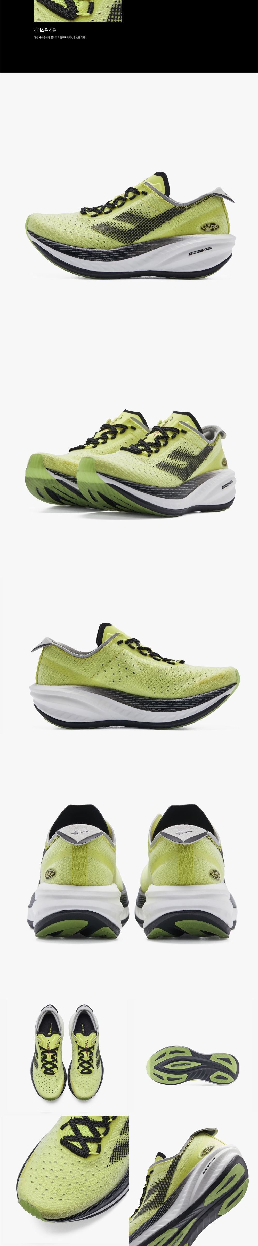 HYPER CARBON FLASH : 탄소 섬유를 적층하여 만든 카본 플레이트가 미드솔 중간에 삽입되어 에너지 리턴 효과를 극대화함 SUPER FOAM : 발포 기술을 활용하여 신규 개발한 가볍고 탄력이 우수한 미드솔 물성을 적용하여 최상의 쿠셔닝을 제공함 힐드랍 9mm / MAXIMAL CUSHIONING : 안정적인 접지를 위한 더욱 넓어진 전족부 바닥면, 높은 추진력과 자연스러운 미드풋을 위한 앞꿈치에서 뒷꿈치까지의 드랍차 9mm, 맥시멀 쿠셔닝 폼이 최상의 러닝 퍼포먼스와 추진력을 가능케함 AIRY TECH : 가벼운 원사를 사용하여 경량성이 우수하며 홀이 큰 메쉬 구조로 러닝시 발생하는 열기 배출에 용이함