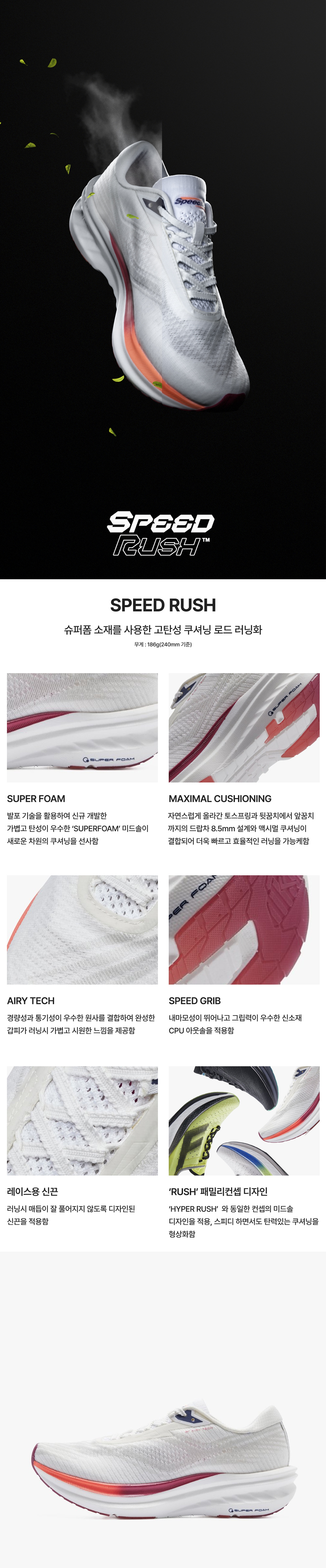 SUPER FOAM : 발포 기술을 활용하여 신규 개발한 가볍고 탄력이 우수한 미드솔 물성을 적용하여 최상의 쿠셔닝을 제공함 AIRY TECH : 가벼운 원사를 사용하여 경량성이 우수하며 홀이 큰 메쉬 구조로 러닝시 발생하는 열기 배출에 용이함 SPEED GRIB : 내마모성이 뛰어나고 그립력이 우수한 신소재 CPU 아웃솔을 적용함 ‘RUSH’ 패밀리 컨셉 디자인 : 상위 버전 ‘하이퍼 러시‘상품과 패밀리 컨셉 몰드 디자인을 적용하여, 고기능성 러닝화 ‘RUSH’시리즈