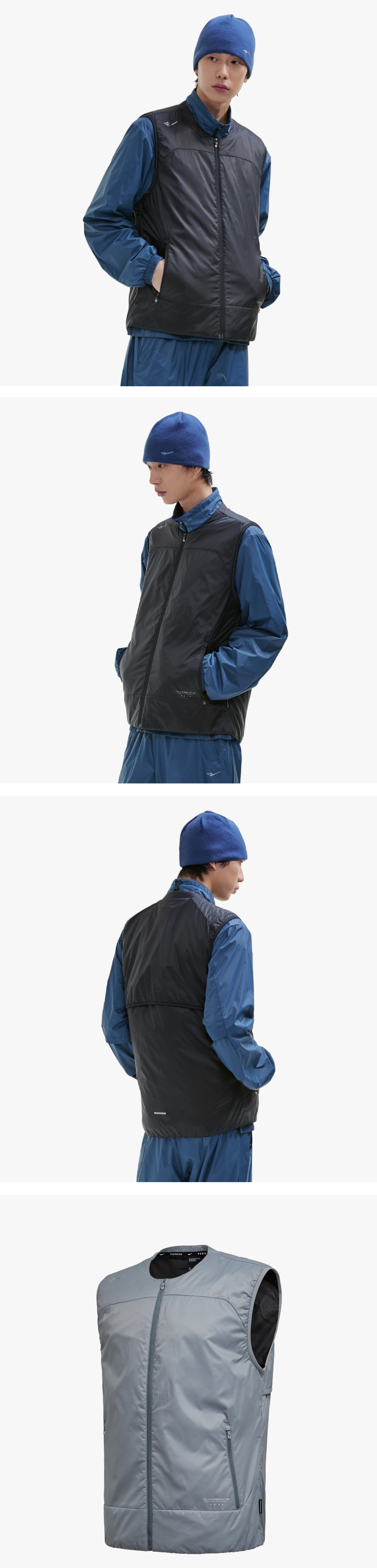 패딩 경량 러닝 베스트 경량 원단과 가슴부위 얇은 패딩 충전재 적용으로 경량성과 보온성이 우수함 등부위 벤틀레이션 기능으로 운동시 발생하는 열기를 빠르게 배출 하여 쾌적한 착용감 어깨라인 접밴드 사양으로 착용시 안정있는 착용감 제공