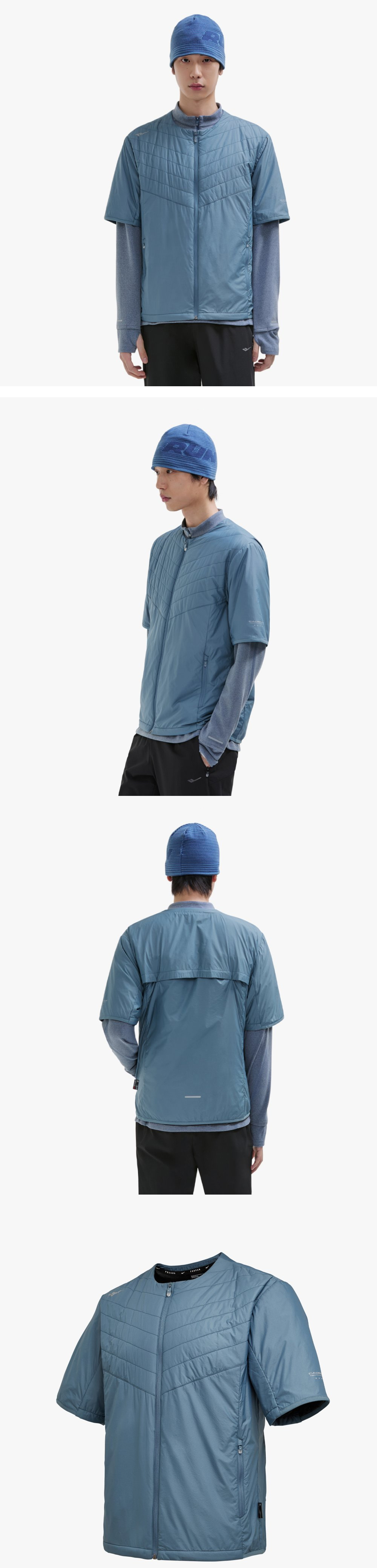 반팔 패딩 커버업2.0 러닝 자켓 패딩 충전재를 사용하여 보온성이 뛰어나며, 세탁 및 관리가 용이 함 등 부위 벤틀레이션 구조를 적용하여 활동 시 빠른 땀배출이 용이함 옆 부위 홑겹(NON패딩) 사양으로 경량화와 러닝 활동시 편안한 활동성 제공