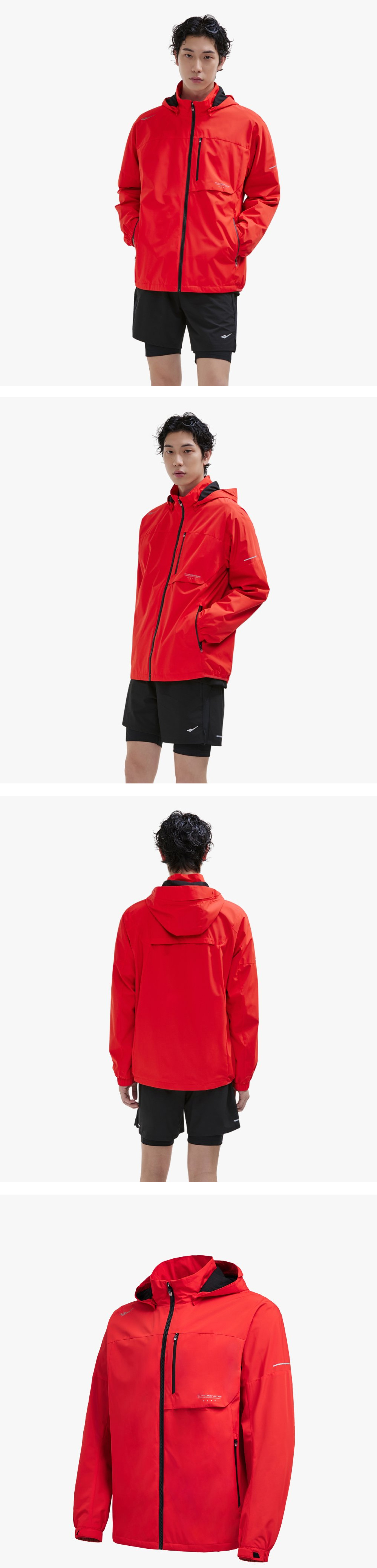 2LAYER 안감 방풍 러닝 자켓 바람은 막아주며, 등 부위 벤틀레이션 구조로 통기가 용이한 구조 뒷 기장 조절 구조로 일반 기장과 엉덩이를 가릴 수 있는 기장으로 사용 가능 후드 탈부착 설계로 용도에 따라 다양한 스타일링 가능