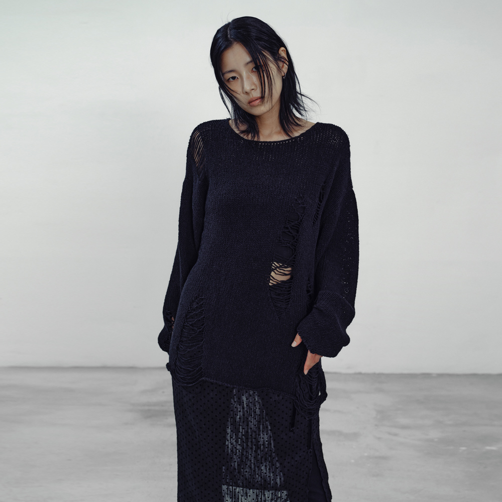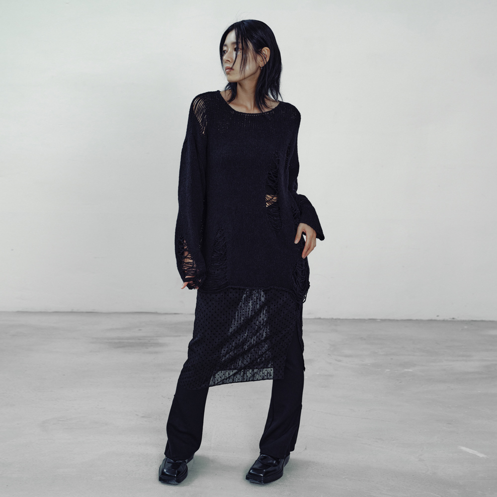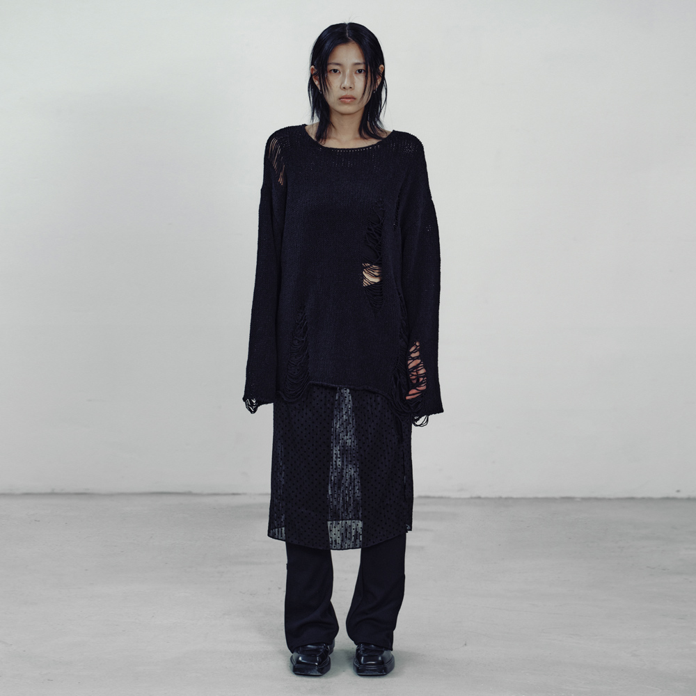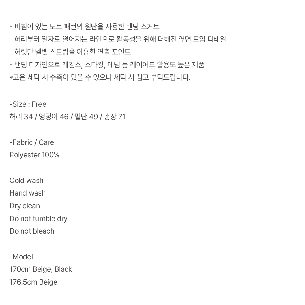 비침이 있는 도트 패턴의 원단을 사용한 밴딩 스커트 허리부터 일자로 떨어지는 라인으로 활동성을 위해 더해진 옆면 트임 디테일 허릿단 벨벳 스트링을 이용한 연출 포인트 밴딩 디자인으로 레깅스, 스타킹, 데님 등 레이어드 활용도가 높은 제품