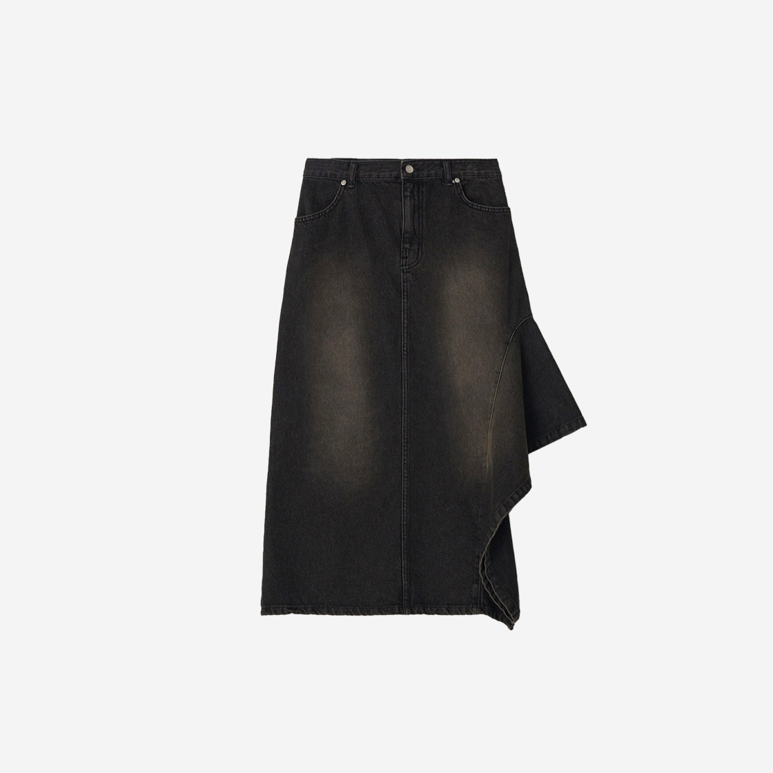 4계절 활용하기 좋은 두께감의 데님 소재를 사용한 언발란스 디자인의 스커트 흑청 데님에 브라운 컬러의 워싱이 더해져 매력적인 제품
