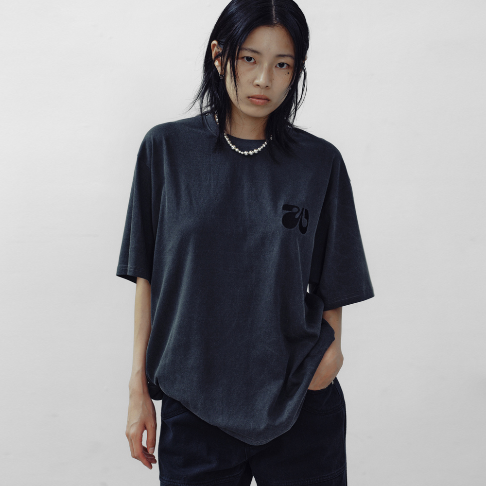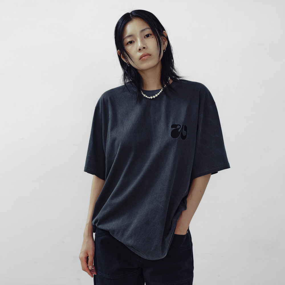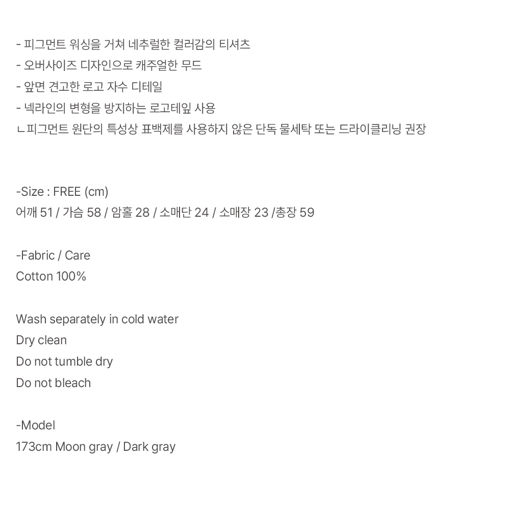 피그먼트 워싱을 거쳐 네추럴한 컬러감의 티셔츠 오버사이즈 디자인으로 캐주얼한 무드 앞면 견고한 로고 자수 디테일 넥 라인의 변형을 방지하는 로고테잎 사용
