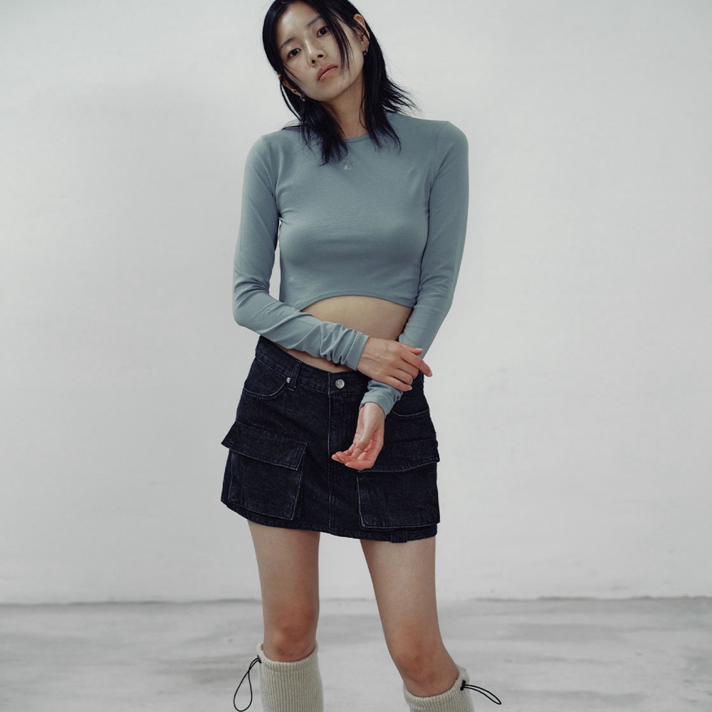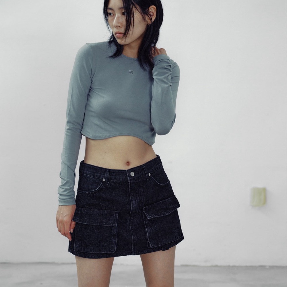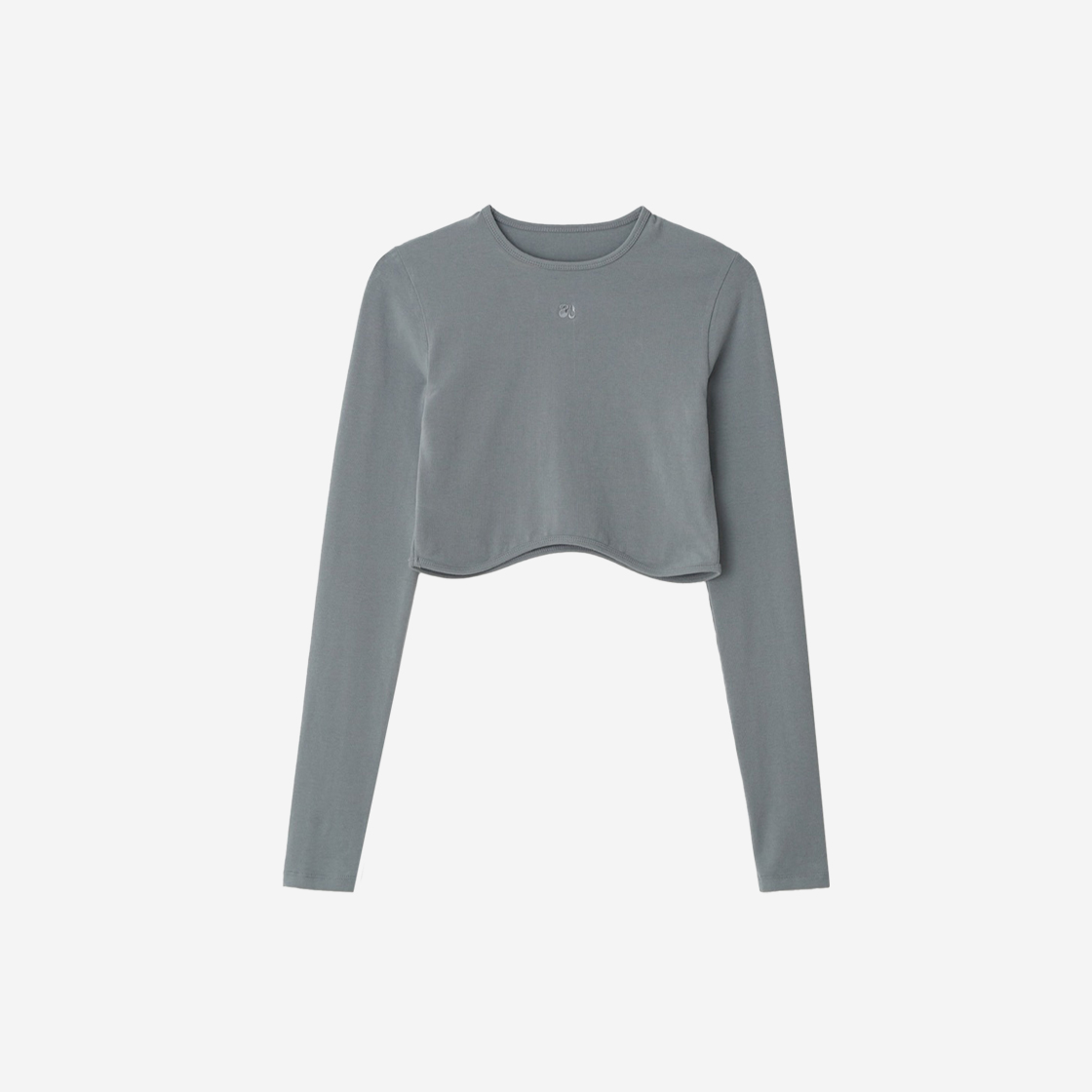 텐션이 좋은 코튼, 스판 혼용 원단을 사용한 크롭 티셔츠 부드러운 착용감으로 베이직한 롱 슬리브 제품 넥 라인 아래 로고 자수를 더한 디자인 크롭 기장의 밑단 시그니처 라인으로 굴려진 디자인