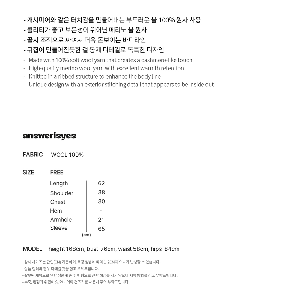 캐시미어와 같은 터치감을 만들어내는 부드러운 울 100% 원사 사용 퀄리티가 좋고 보온성이 뛰어난 메리노 울 원사 골지 조직으로 짜여져 더욱 돋보이는 바디라인 뒤집어 만들어진 듯한 겉 봉제 디테일로 독특한 디자인