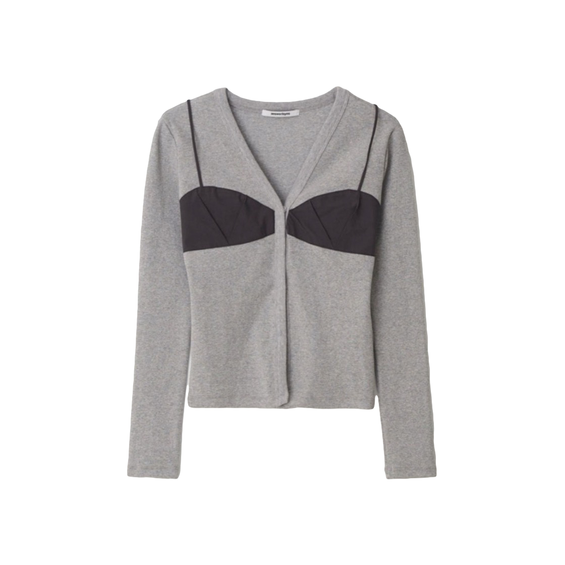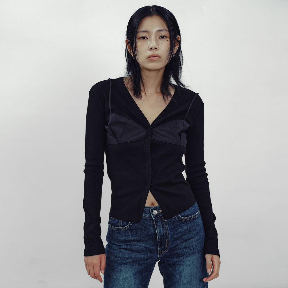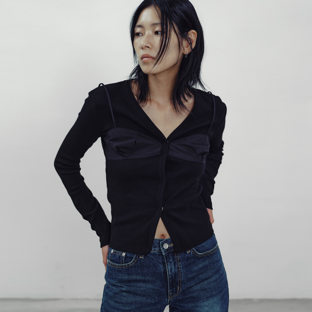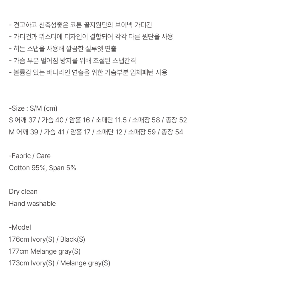 견고하고 신축성좋은 코튼 골지원단의 브이넥 가디건 가디건과 뷔스티에 디자인이 결합되어 각각 다른 원단을 사용 히든 스냅을 사용해 깔끔한 실루엣 연출 가슴 부분 벌어짐 방지를 위해 조절된 스냅간격 볼륨감 있는 바디라인 연출을 위한 가슴부분 입체패턴 사용