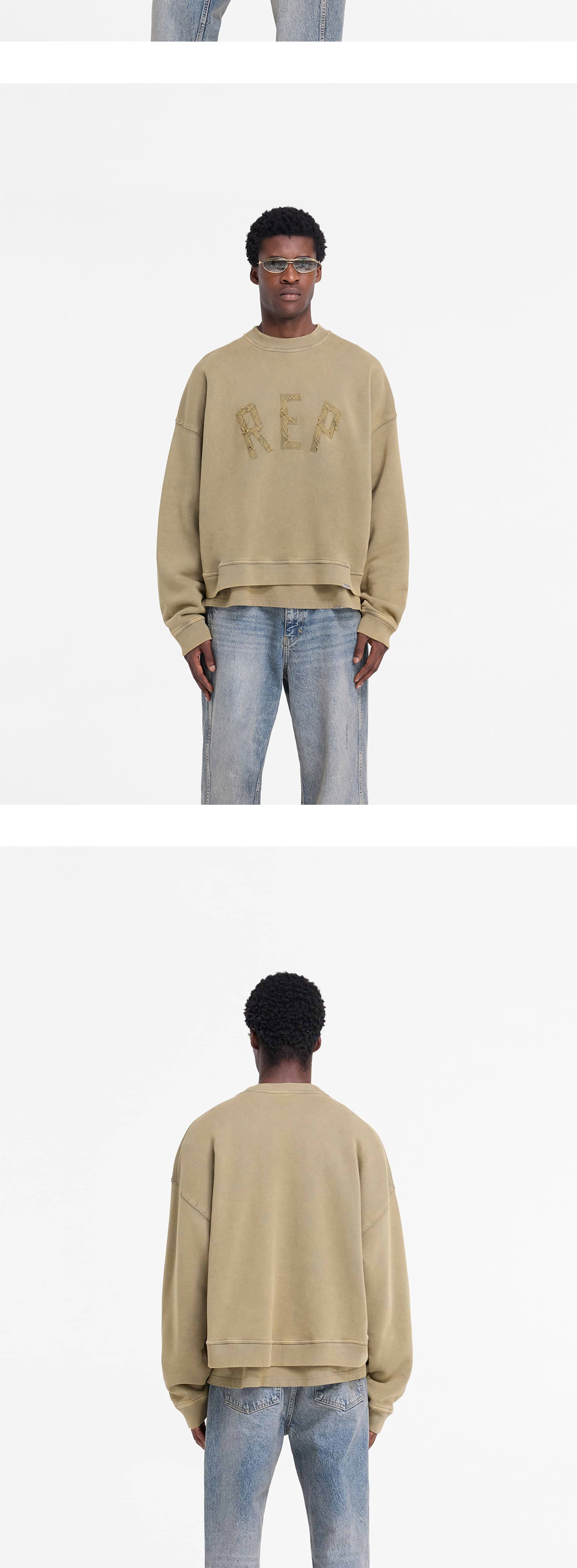 독특한 로고 디자인이 돋보이는 리프레젠트의 헤비웨이트 저지 코튼 크루넥입니다. - 오버사이즈 박시 핏 - 선 페이드 워싱 - 전면 데미지 가공된 로고 아플리케 - 전면 밑단 금속 로고 막대 디테일