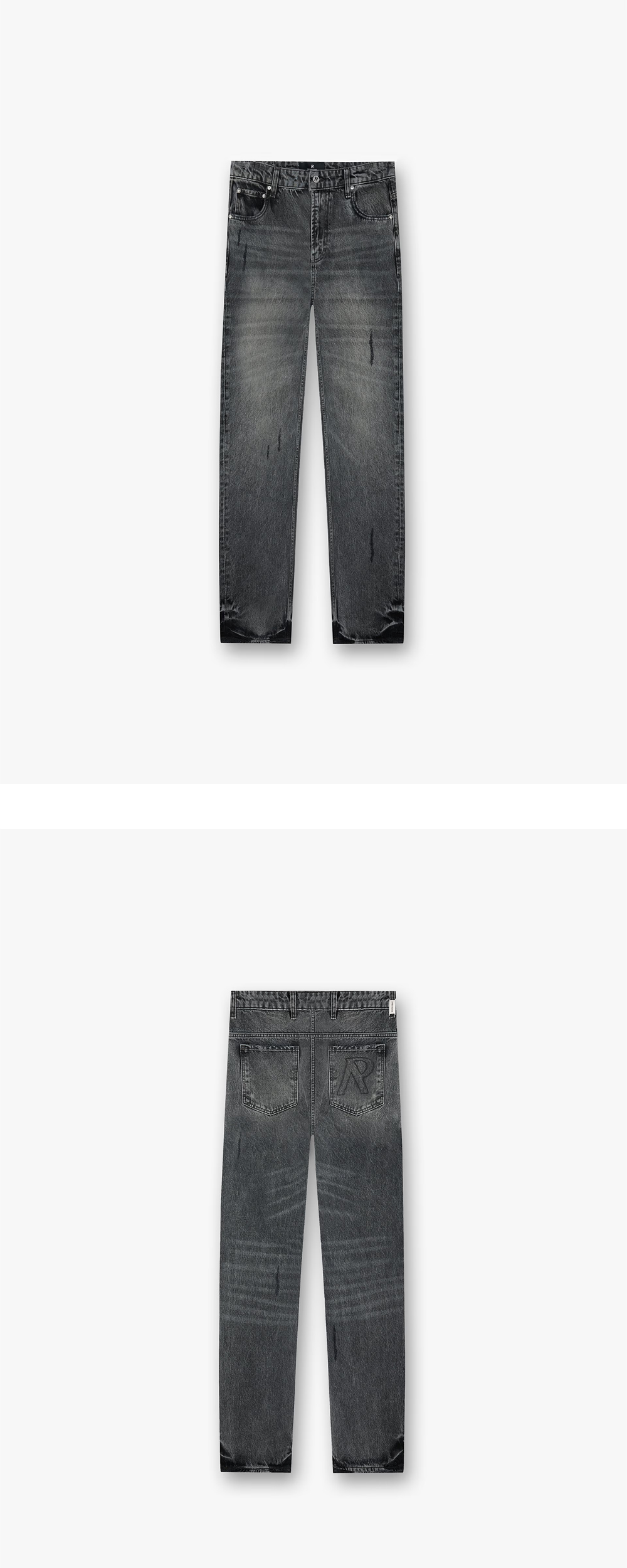 독특한 밑단 워싱과 자수 백 포켓이 매력적인 리프레젠트의 워싱 진입니다. - 스트레이트 핏 - 페이드 아웃 워싱 - 위스커링 & 캣 스크래치 디테일 - 우측 백 포켓 로고 자수