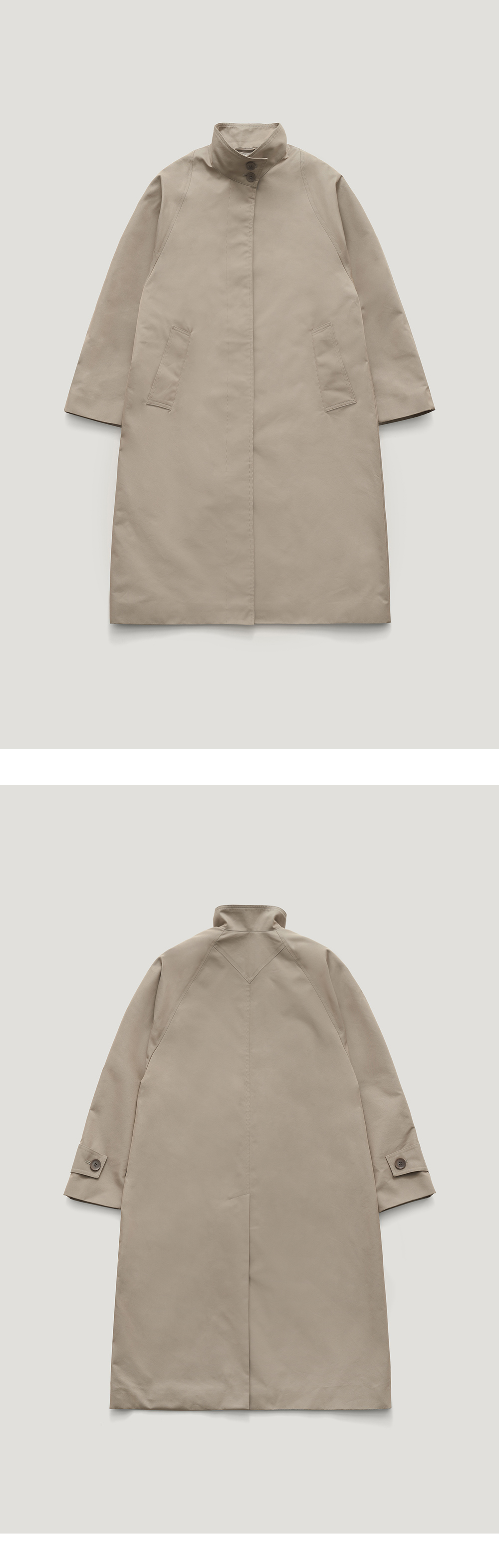 [배송 안내] *해당 상품은 9/25(수)부터 순차적으로 예약 배송되는 상품입니다. 오버사이즈의 라글란 소매와 투톤컬러가 돋보이는 싱글 트렌치코트입니다. 탄탄하고 부드러운 터치감이 느껴지는 코튼혼방원단으로 제작되었습니다. 앞 면의 양 사이드 웰트 포켓 구성이며 카라에 두개의 버튼을 두어 다양한 스타일링이 가능한 활용도 높은 제품입니다. 내부에 사용이 가능한 포켓이 있으며 포켓 안쪽에 로고 자수 디테일이 있습니다.