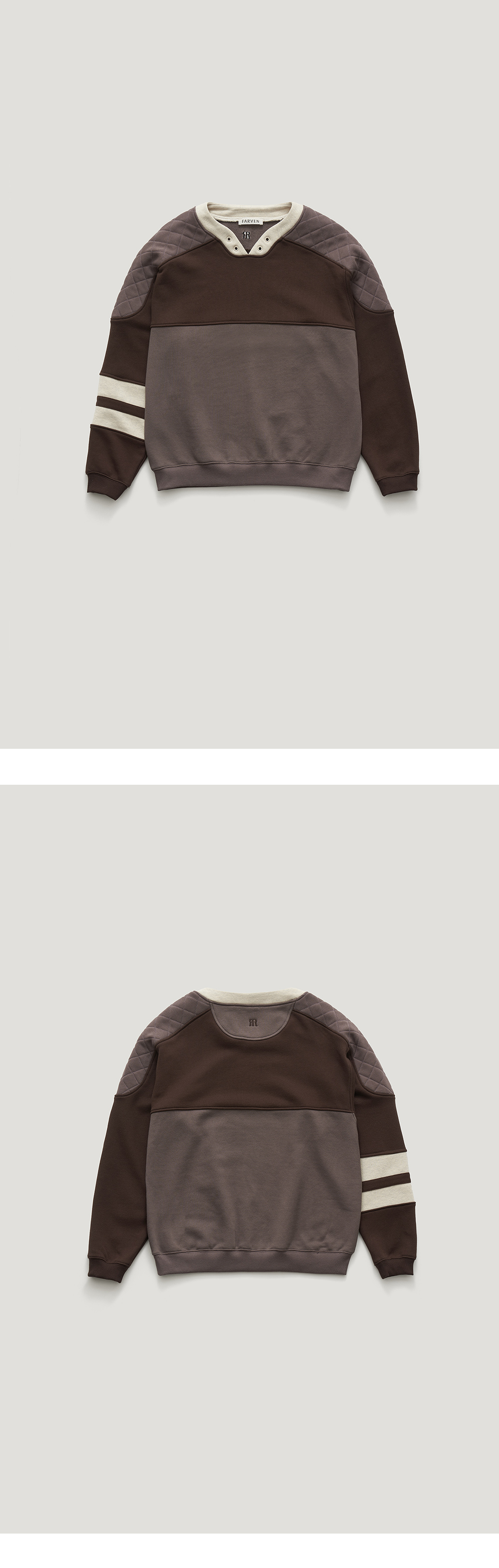 [배송 안내] *해당 상품은 9/25(수)부터 순차적으로 예약 배송되는 상품입니다. 독특한 넥 라인과 도톰하게 퀼팅 된 어깨 패널이 포인트인 컬러블록 맨투 맨입니다. 래글런 소매로 자연스럽게 떨어지는 어깨 라인과 적당히 여유 있는 실루엣으로 편안한 착용감이 느껴집니다. 부분 부분 컬러 배색으로 포인트를 주었으며 뒷 넥 라벨판 위 파르벵 심볼 자수 디테일로 마무리했 습니다.
