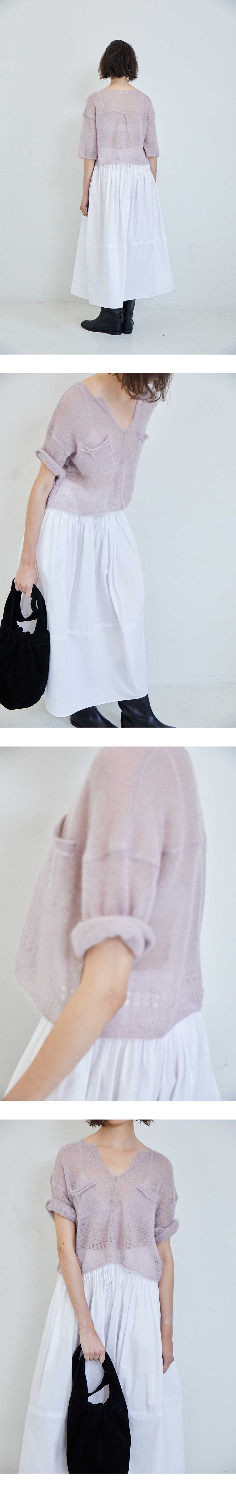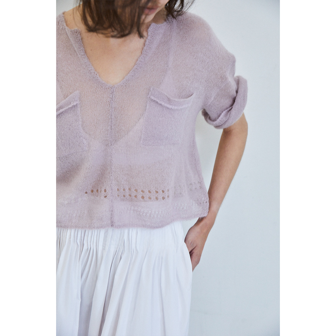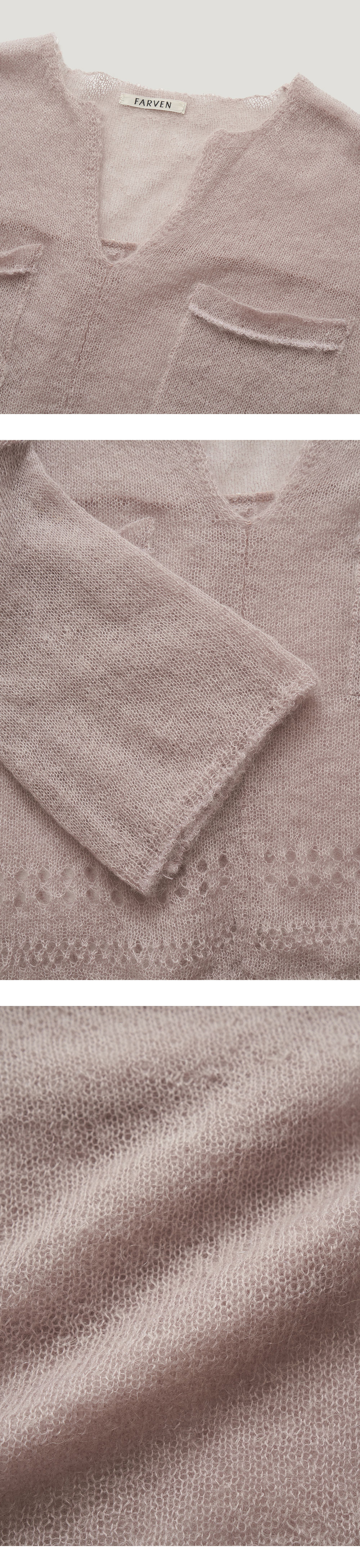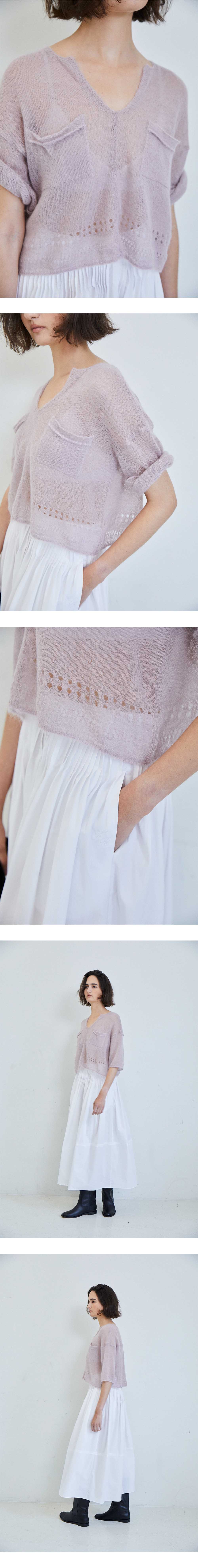 [배송 안내] *해당 상품은 9/25(수)부터 순차적으로 예약 배송되는 상품입니다. 크롭한 기장감과 여유로운 실루엣의 키드모헤어니트입니다. 적당히 파인 넥과 함께 자연스럽게 넘어가는 여밈으로 두개의 아웃포켓디테일과 밑단쪽에 구멍이 난것같은 스커시조직 디테일을 추가하였습니다. 다양한 상의와 레이어드하기 좋은 활용도가 높은 아이템입니다.