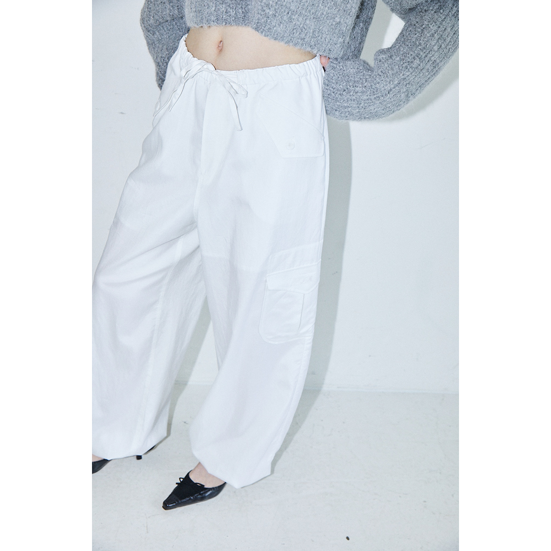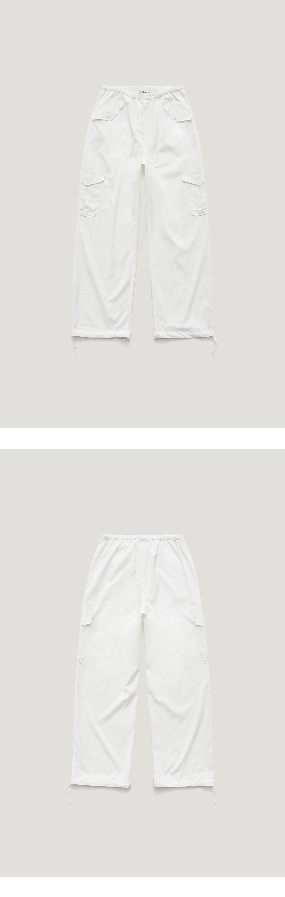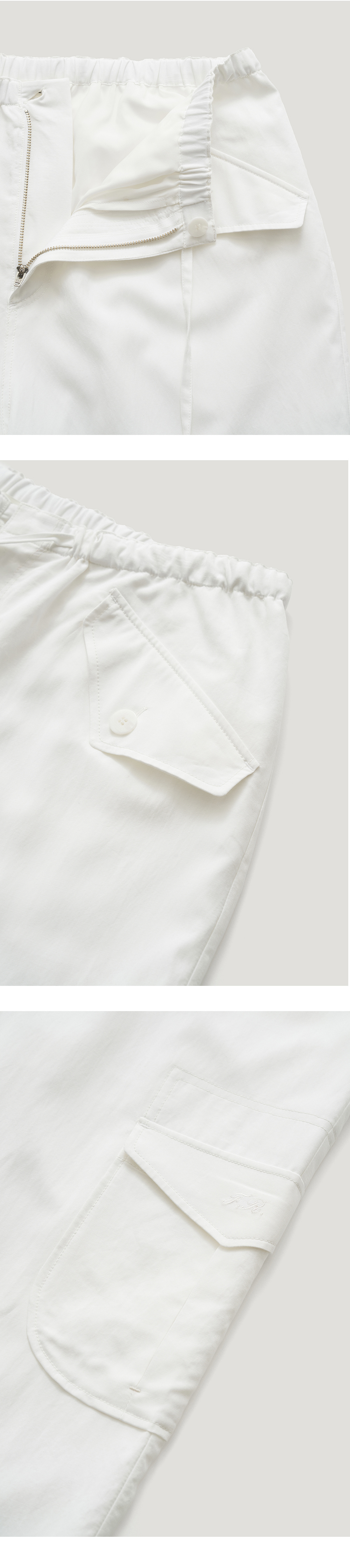 [배송 안내] *해당 상품은 9/25(수)부터 순차적으로 예약 배송되는 상품입니다. 179G 중량의 부드러운 코튼, 레이온 혼방 소재로 만들어진 카고팬츠입니다. 릴랙스드 핏으로 이루어져 있으며, 포켓의 덮개 한쪽에는 FR로고가 자수로 장식되어 있으며, 사이즈 조절이 가능한 패브릭 스트랩과 버튼이 있습니다. 네이비, 블랙, 아이보리 3가지 컬러로 아이보리컬러에는 안감이 있어 비침을 최소로하였으며 일상에서 다양하게 스타일링하기 좋은 팬츠입니다.