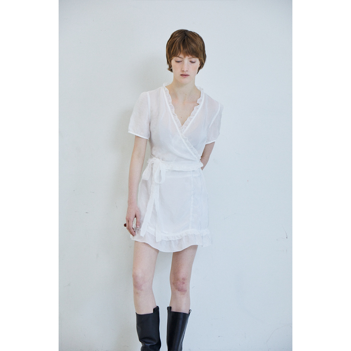 [배송 안내] *해당 상품은 9/25(수)부터 순차적으로 예약 배송되는 상품입니다. 고급스러운 광택감과 텍스쳐가 돋보이는 러블리한 무드의 하프 슬리브 랩 원피스입니다. 투피스를 원피스로 풀어낸듯한 디자인에 안정적인 착용감을 위해 단추, 스냅 여밈 구조로 완성도를 높였습니다. 넥과 밑단 라인을 따라 부담스럽지 않게 잡힌 러플과 절개 라인을 따라 자연스럽게 잡힌 주름이 조화롭게 어우러집니다. 스커트 부분 안감 처리로 비침을 최소화하였으며 허리 스트랩을 활용해 보다 다양하고 안정적인 실루엣 을 연출할 수 있습니다.