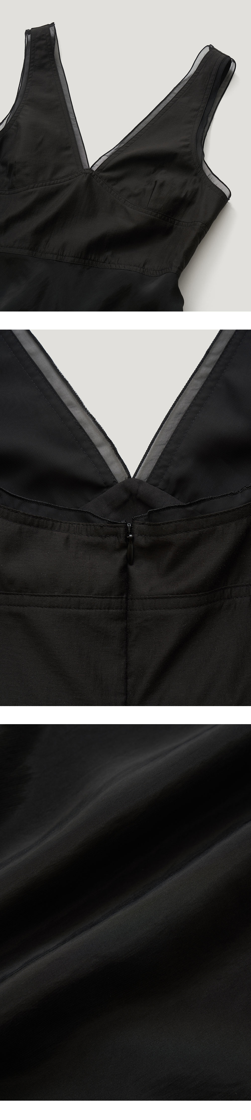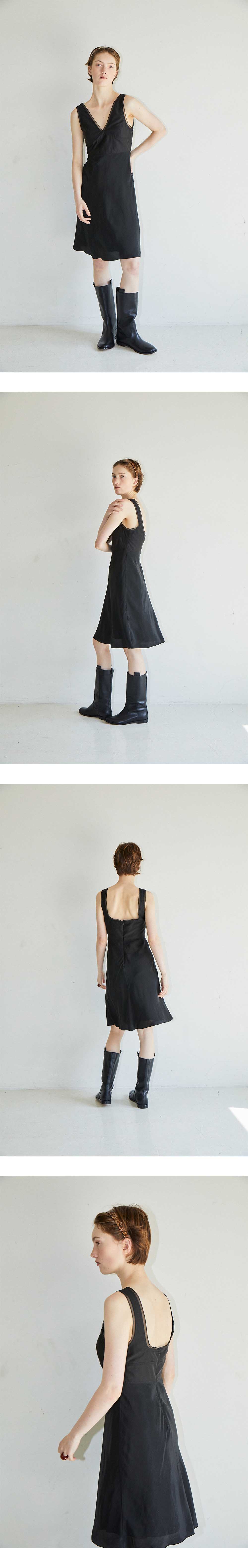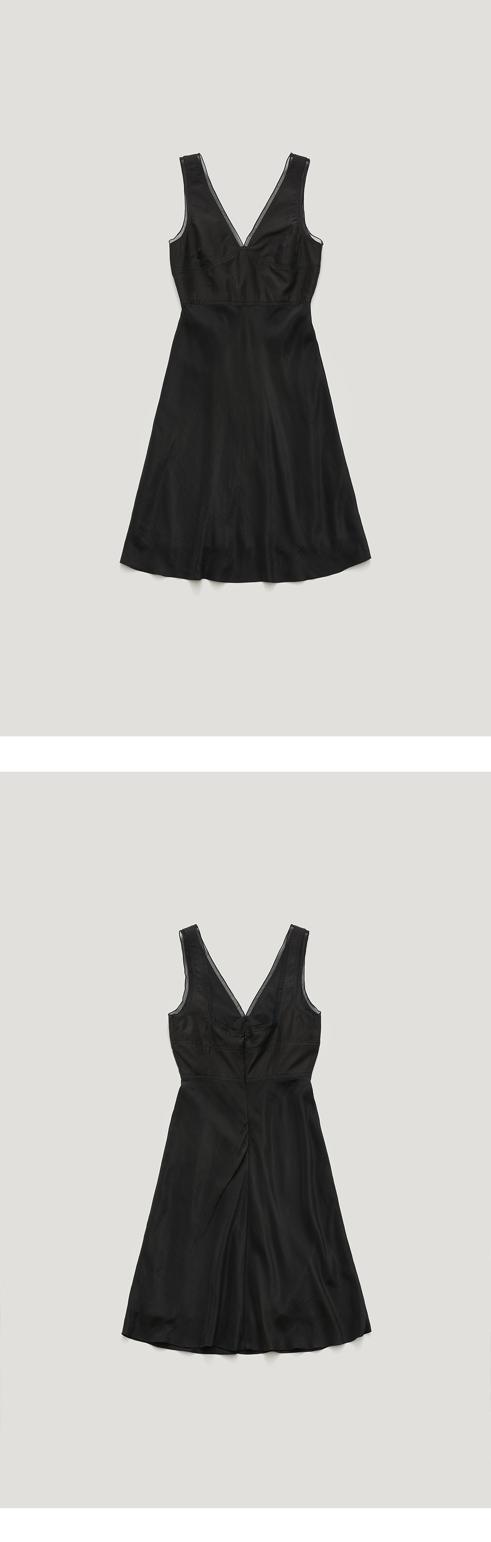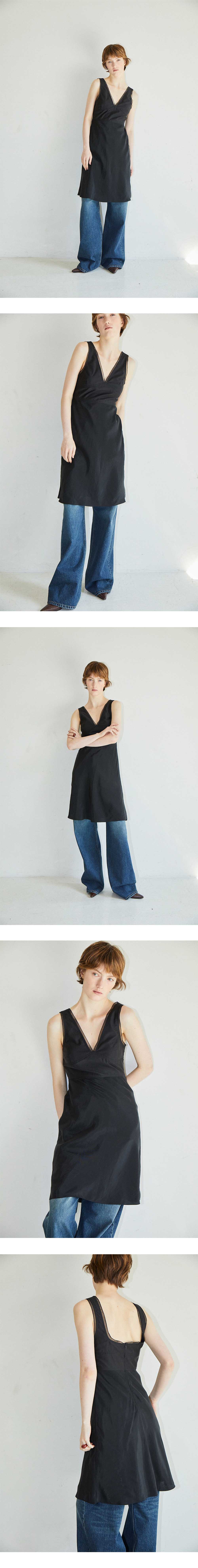 [배송 안내] *해당 상품은 9/25(수)부터 순차적으로 예약 배송되는 상품입니다. 깊게 파인 V 넥 롱 슬리브리스 드레스입니다. 톤온톤 느낌의 세가지 시스 루 원단이 다중으로 덧대어져 조화를 이루는 디자인입니다. 안감 구성으 로 비침을 최소화하여 단독으로도 착용 가능하며 미디 기장감으로 레이어 드 하기 좋은 제품입니다. 조금 더 편안한 착용감을 위해 기존 DEEP V- NECK DRESS에서 넥 깊이를 올리고 상동 사이즈를 늘렸습니다.