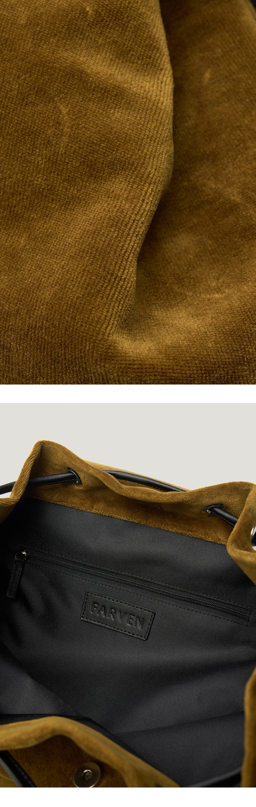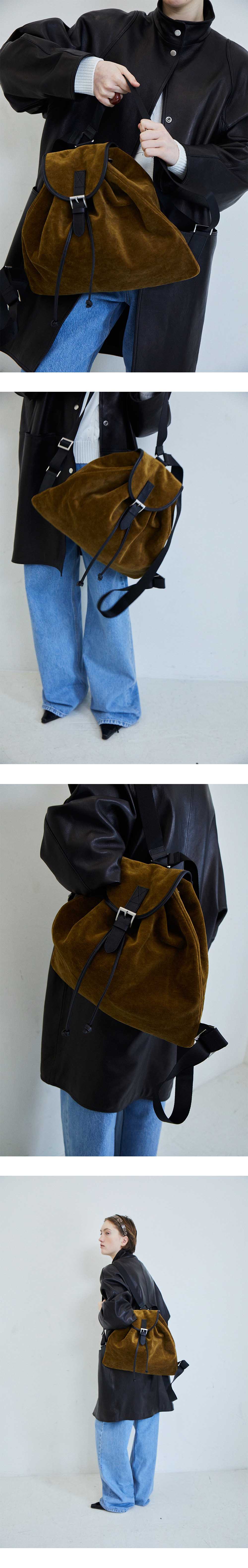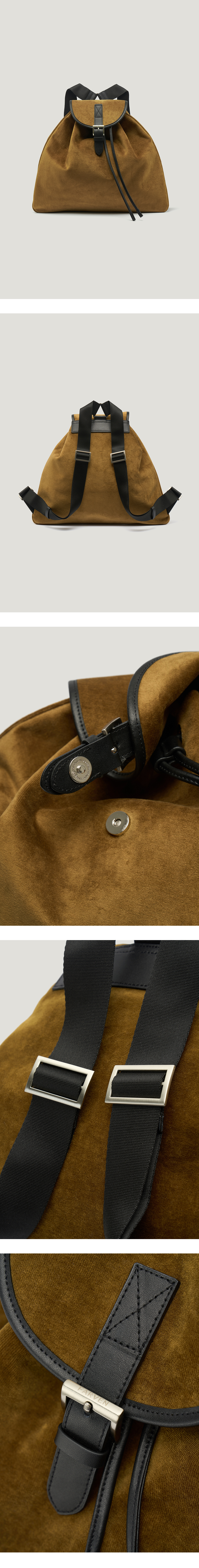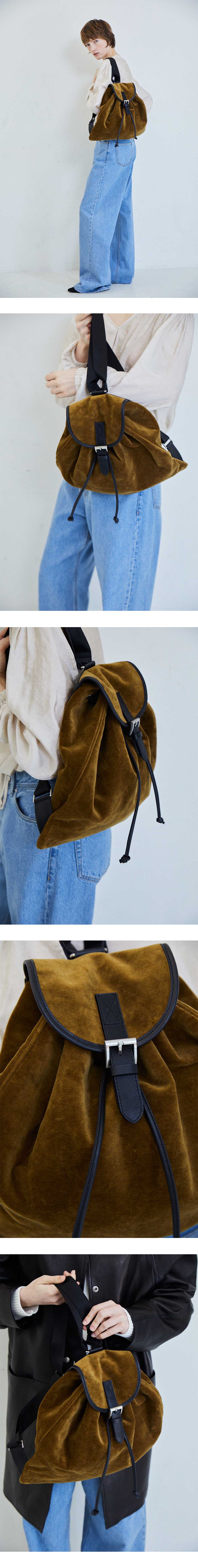 [배송 안내] *해당 상품은 9/25(수)부터 순차적으로 예약 배송되는 상품입니다. 폭신폭신한 촉감과 고급스러운 광택감이 돋보이는 벨로아 소재와 소가죽 트리밍의 스트링이 조화를 이루는 백팩입니다. 넉넉한 수납력과 가벼운 무게감으로 캐주얼하게 데일리로 착용하기 좋은 제품입니다. 이너 지퍼 포켓 별도 구성으로 수납이 용이하며 심플한 가죽 버클 자석구조로 활용성을 높였습니다.