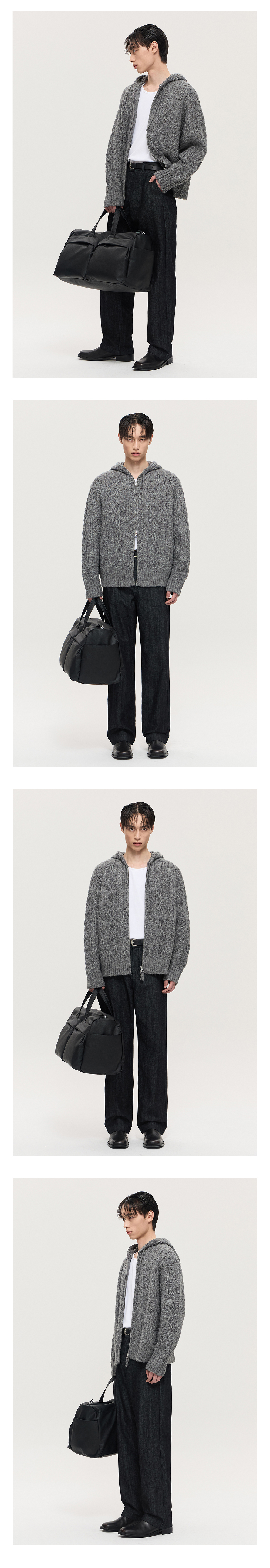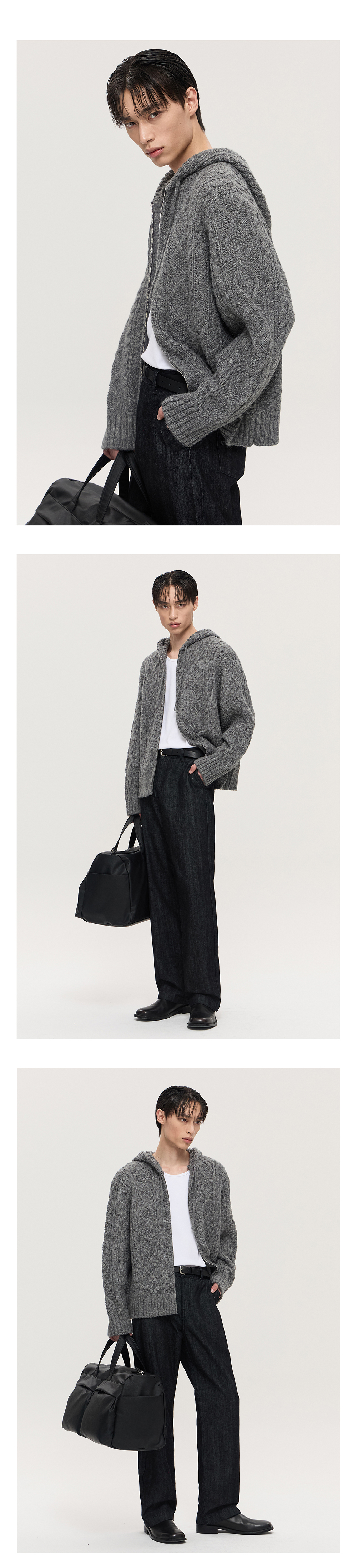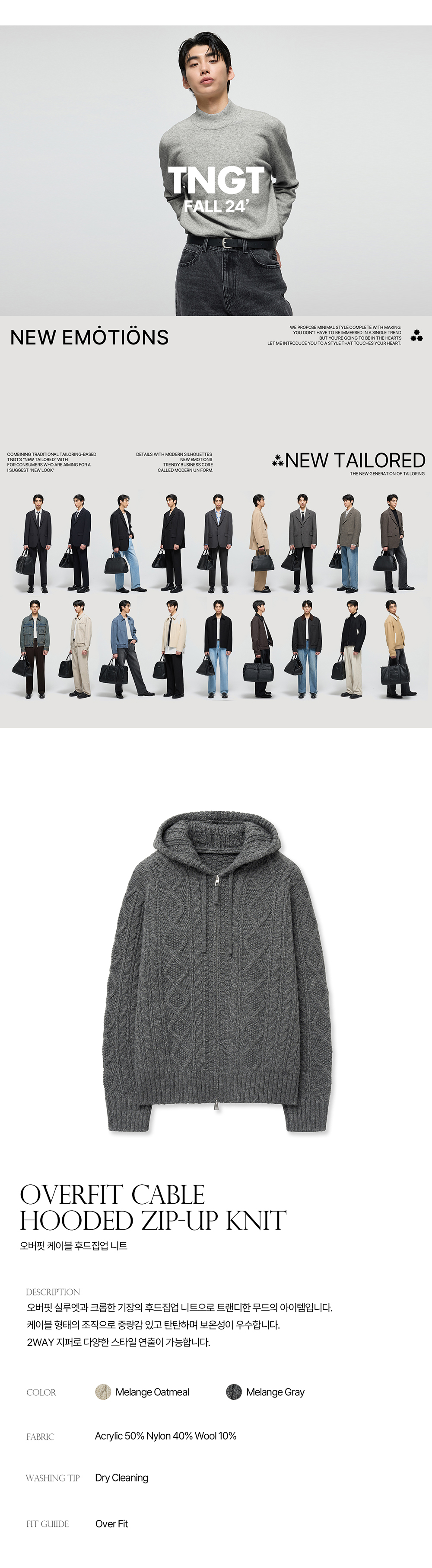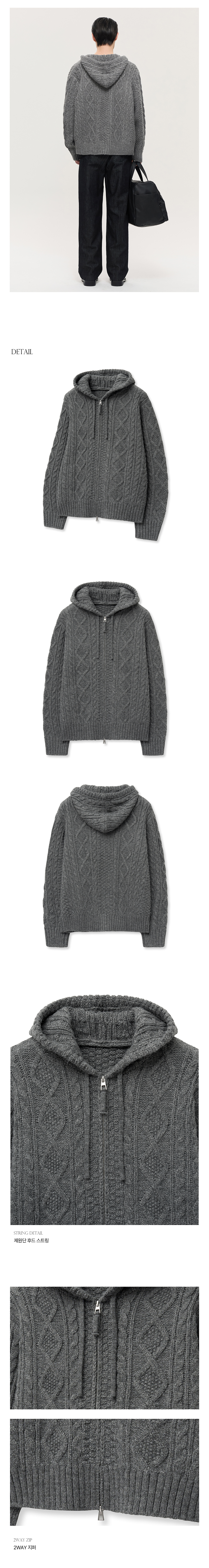 티엔지티 오버핏 케이블 후드집업 니트 멜란지그레이