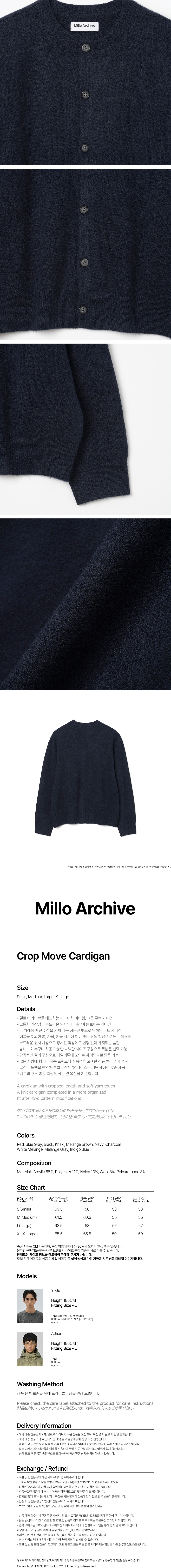 - 크롭한 기장감의 원사의 터치감과 착용감이 돋보이는 무브 가디건 - 2회 패턴 수정을 통해 안정적인 니트 가디건의 독보적인 정갈한 핏 - 여름을 제외한 봄, 가을, 겨울 시즌에 이너 가디건으로 또는 단품으로 활용성 매우 우수 - 부드러운 원사 사용하여 오랜 시간 착용하여도 변형 없음 - 남녀노소 착용 가능한 스펙 - 감각적인 컬러를 통해 일반적인 스타일링에 포인트를 줄 수 있음 - 큰 사랑을 통해 시즌 트렌드와 범용성을 고려한 신규 컬러 추가 발매