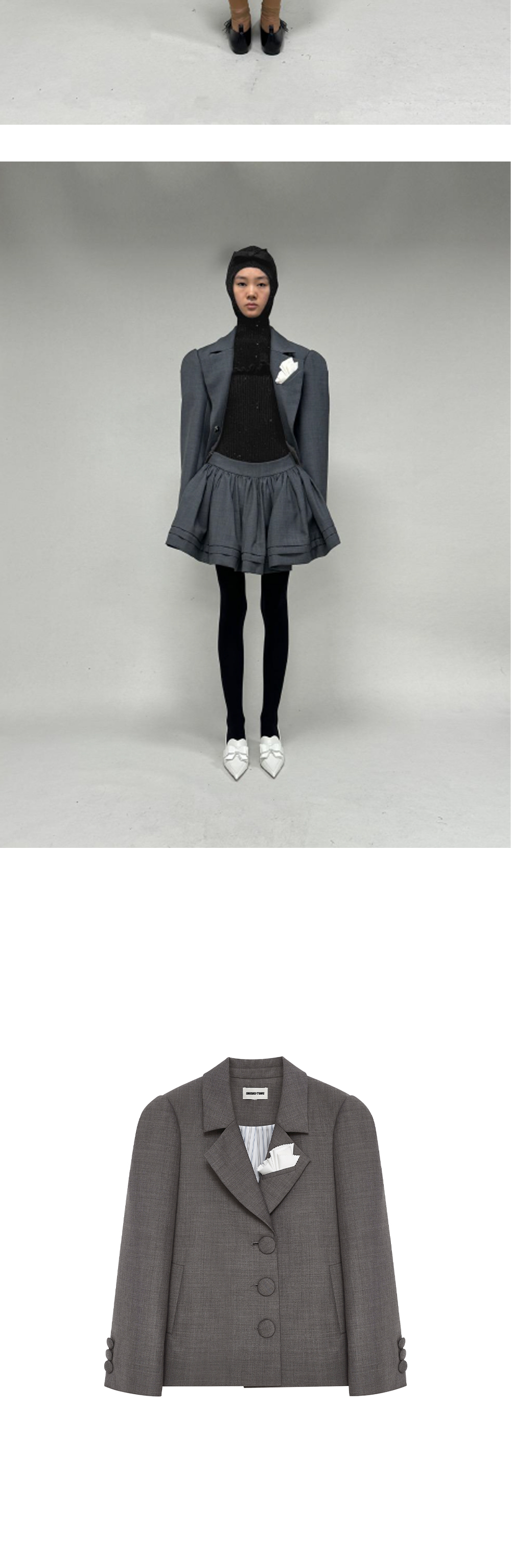 강조된 단추와 유니크한 행커치프 디테일로 위트를 더한 슈슈통의 오버사이즈 수트 자켓입니다. - 라펠 칼라에 적용된 행커치프 디테일 - 패디드 숄더 - 과장된 실루엣 및 버튼