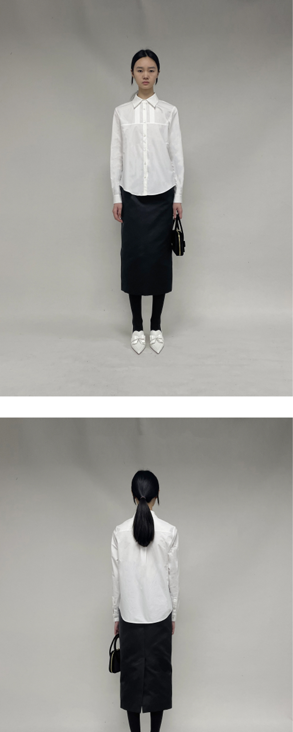 무릎 아래까지 우아하게 떨어지는 슈슈통의 피티드 스커트입니다. - 전면에 적용된 다트 스티치 - 후면 히든 지퍼 클로징 - 후면 트임 디테일