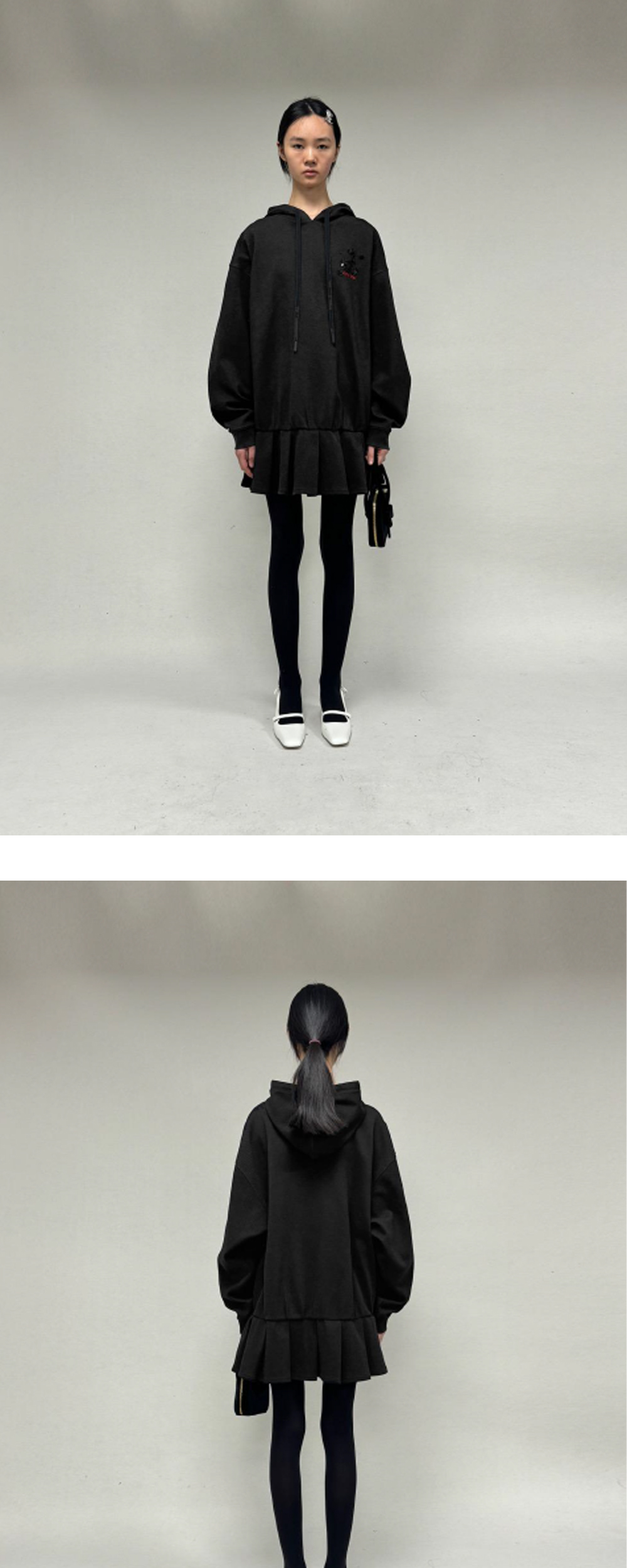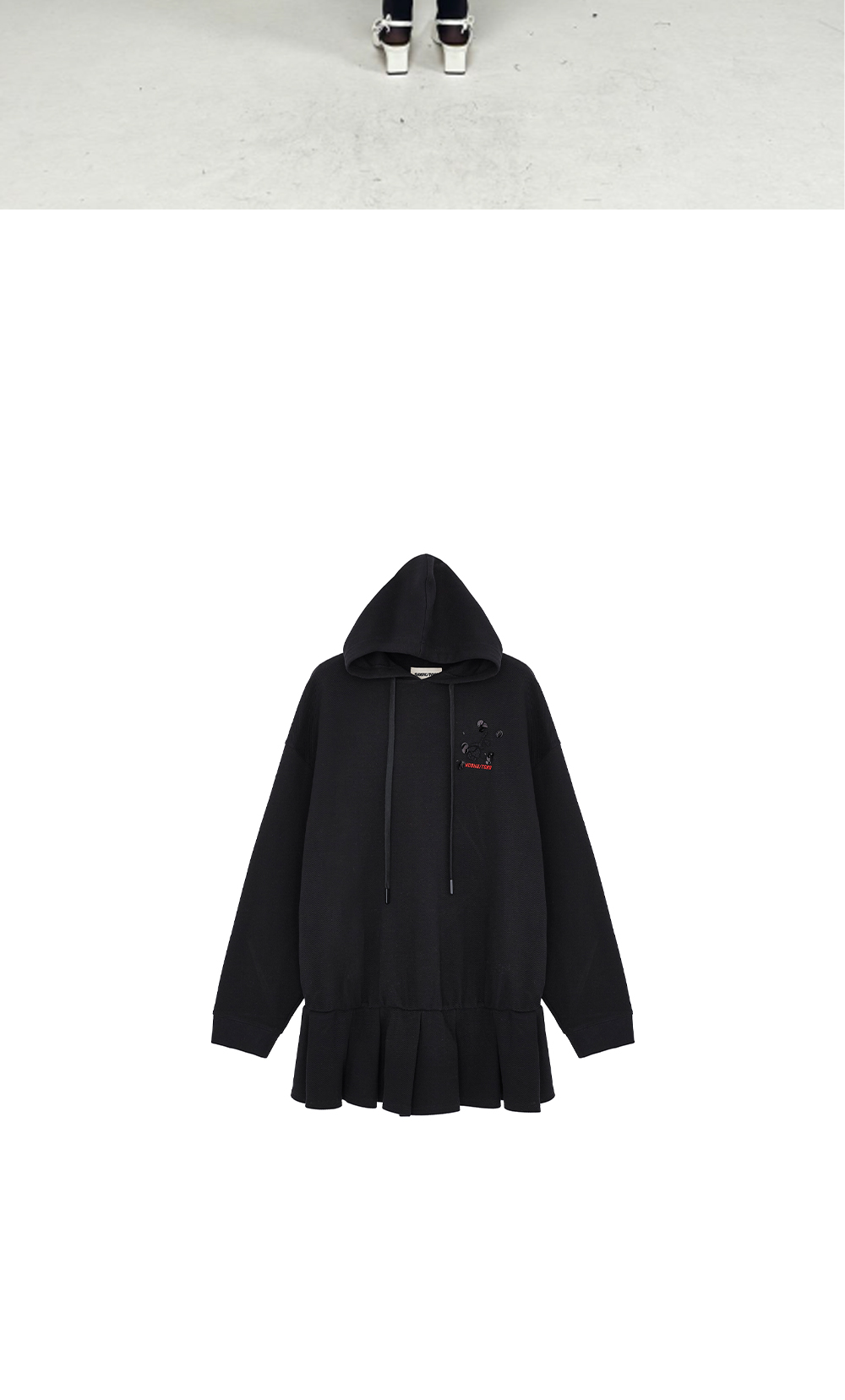 후드 티셔츠와 미니스커트가 합쳐진 형태인 슈슈통의 후디 드레스입니다. - 드롭 숄더 디자인 - 밑단 플리츠 디테일
