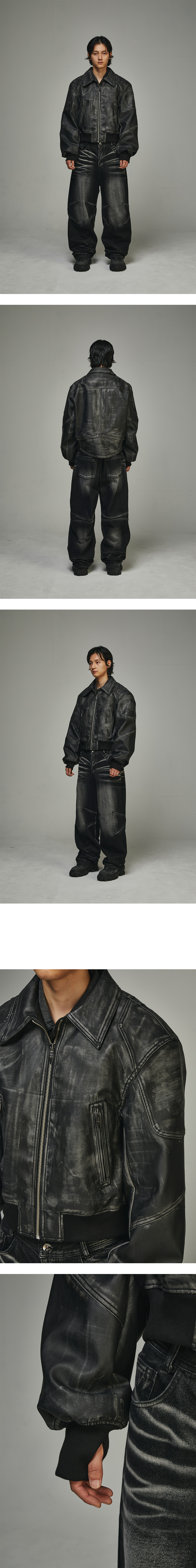 견갑 모양의 어깨 장식 디테일 활동성있는 와이드한 핏의 소매 워머로 사용 가능한 기장감 있는 소매 시보리와 핑거홀 디테일 기장감 있는 후면부 커브드 밑단 디테일 거친 질감의 워싱 디테일 BLR 시그니처 지퍼 슬라이더 후면부 BLR 시그니처 데님 패치