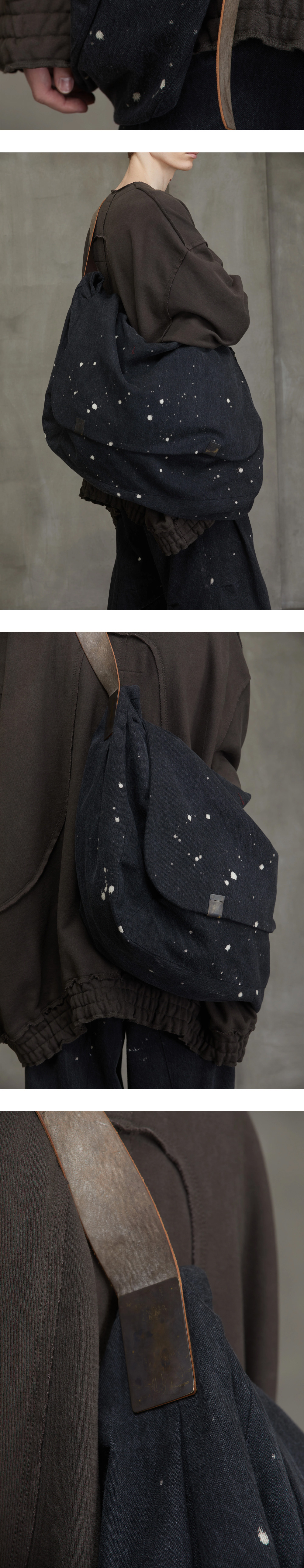오랜 세월을 간직한 듯한 스트랩이 룩에 포인트를 주는 지기첸의 데님 숄더 백입니다. - 내부 포켓 - 빈티지 가공된 가죽 스트랩 - 페인트가 뿌려진 듯한 디테일 - 금속 부자재