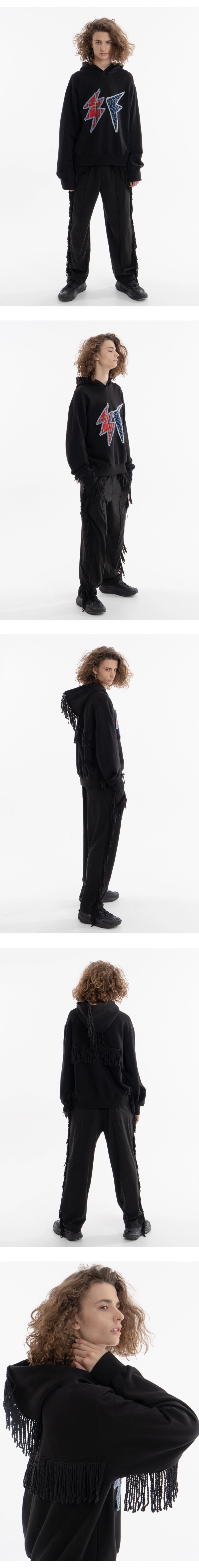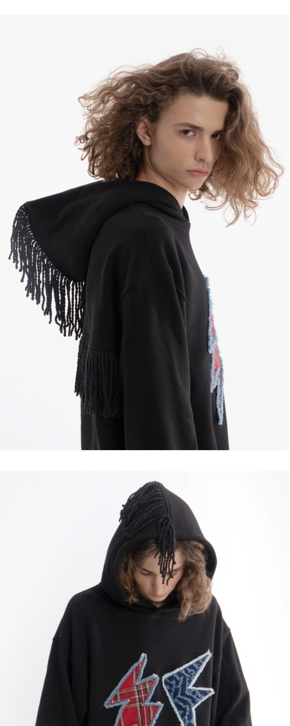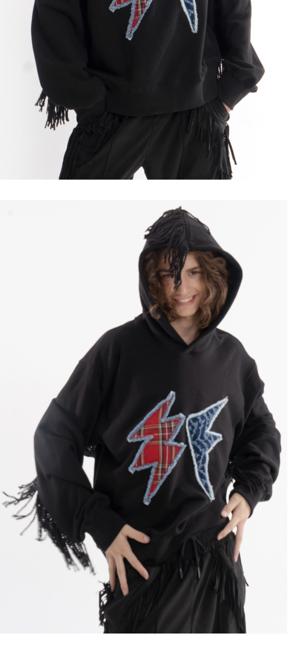 핸드메이드 디테일이 돋보이는 오버사이즈 후드티셔츠입니다. 전면부의 패치워크 디자인은 전부 수작업으로 진행되었습니다. 독특한 패턴의 다른 두 원단을 레이저 재단 후, 데님라인을 덧대여 직접 봉재한 패치워크는 훌륭한 디자인 완성도를 자랑합니다. 박시하면서 크롭한 기장으로 다양한 실루엣 연출이 가능합니다. 소매와 등판 후드 절개라인을 따라 물려 봉제된 스트링 디테일은 라이트닝 후드만의 유니크한 디자인과 무드를 완성시킵니다. 텐타/덤블 가공 후 바이오 워싱을 거친 C/P쭈리 원단으로 제작되어, 원단의 변형 및 뒤틀림이 적고 튼튼합니다. 한여름을 제외한 3계절에 착용이 가능한 후드셔츠로서, 단독착용시에도 자신만의 유니크한 스타일링이 가능한 제품입니다. - Model Size - 남성 : 186cm / 69kg (2사이즈 착용)