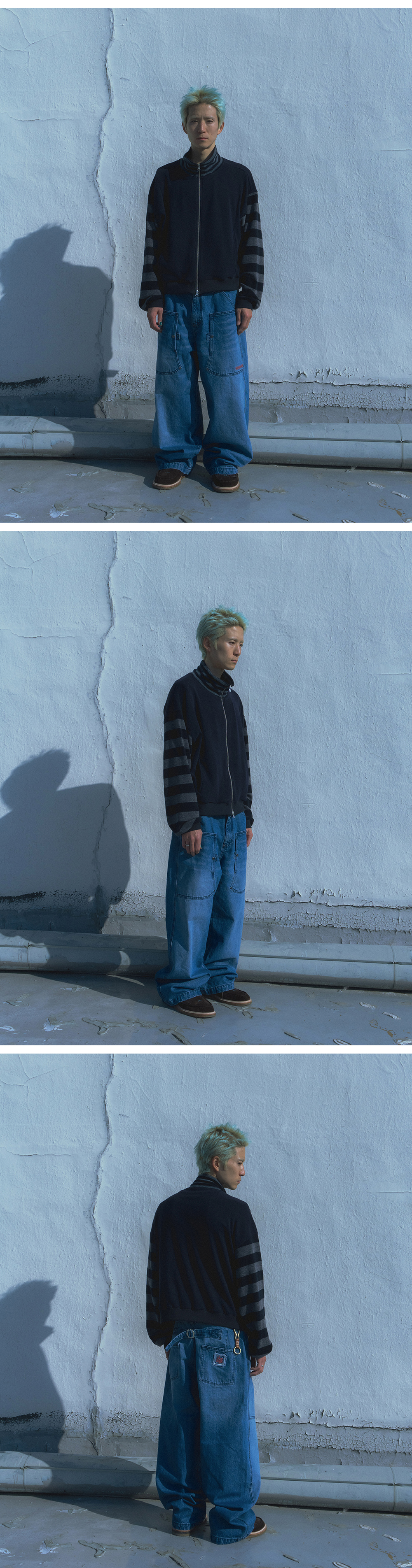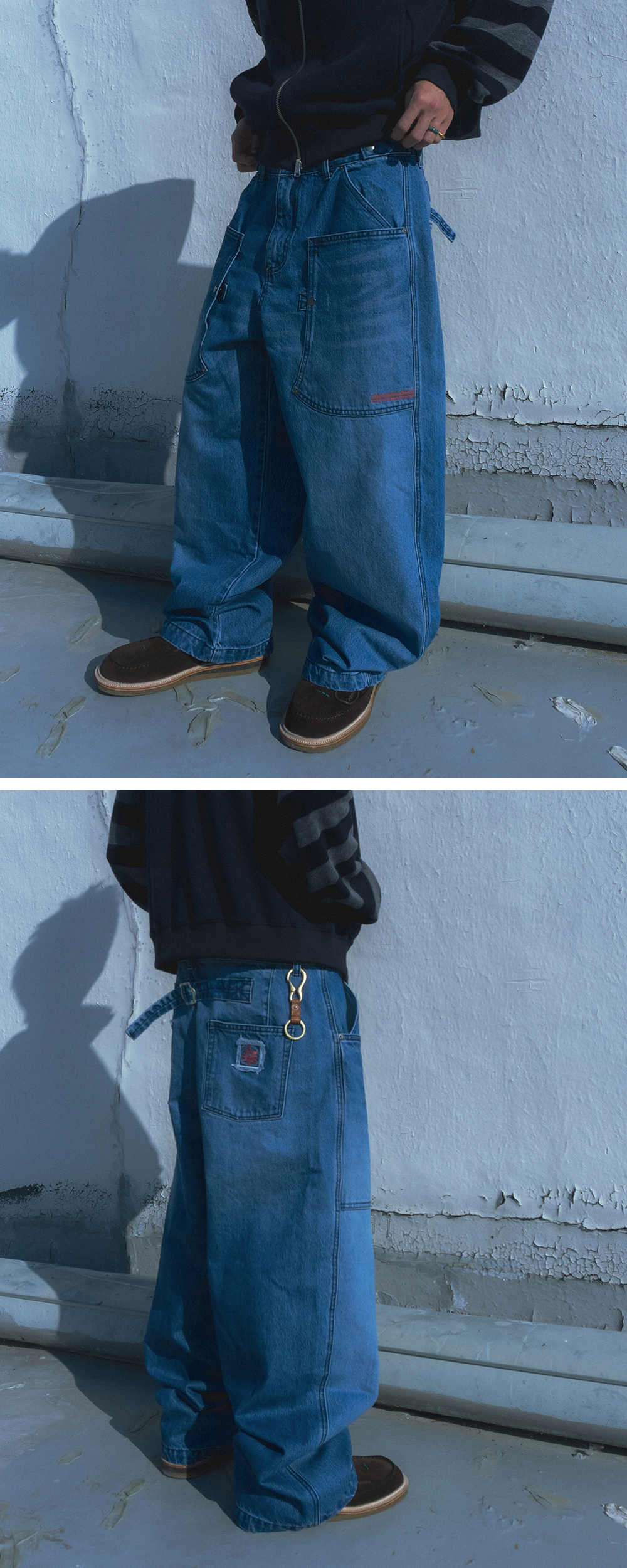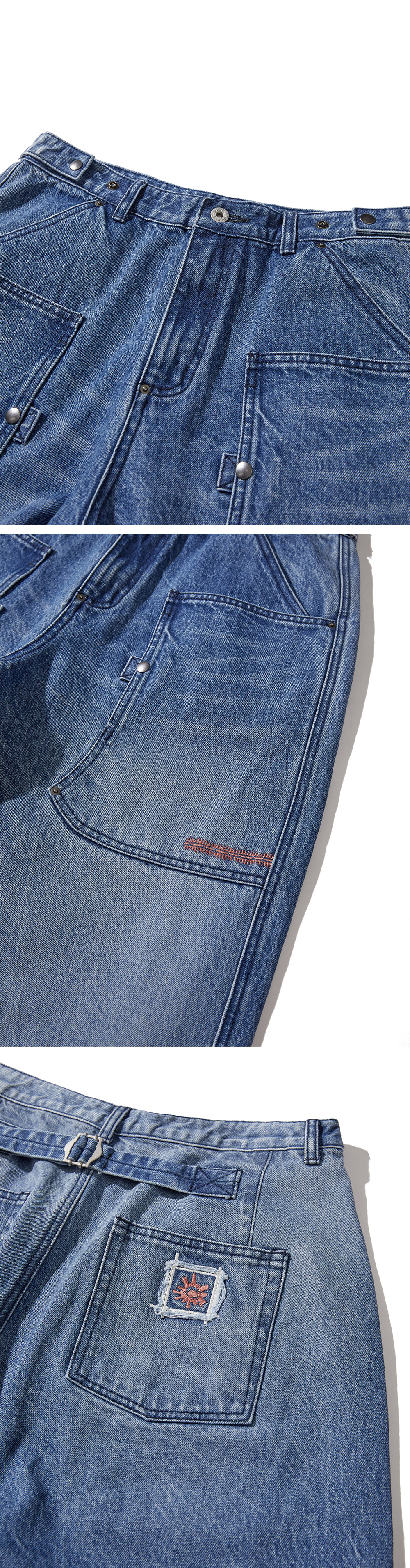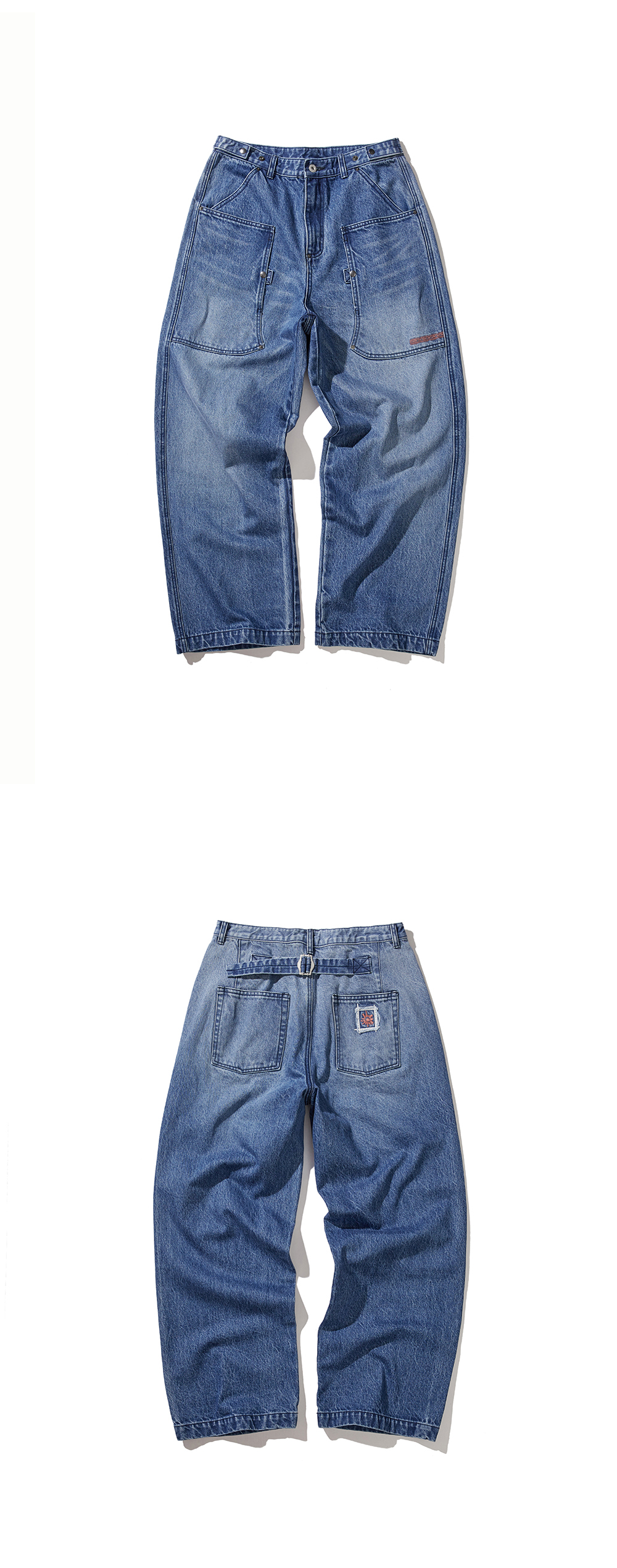 Product Info. - 고급 원사로 제직되어 탄탄한 밀도와 소프트한 착용감의 13.5oz 데님 원단 - 워크웨어에 기반하여 넉넉하게 떨어지는 실루엣의 와이드 핏 - 자연스러운 퍼커링과 페이딩 처리, 깊이 있는 컬러감의 워싱 가공 - 빈티지 워크 팬츠 디테일 요소와 카펜터 팬츠 곡선 형태를 믹스한 디자인 - 프론트 포켓 사이드 웨스턴 무드 패턴 자수 포인트 - 후면 포켓 빈티지 무드의 패치 자수 포인트 - 허리 사이즈 조절 가능한 벨트라인 양 사이드 버튼 어드저스터 - 후면 스트랩 어드저스터 디테일