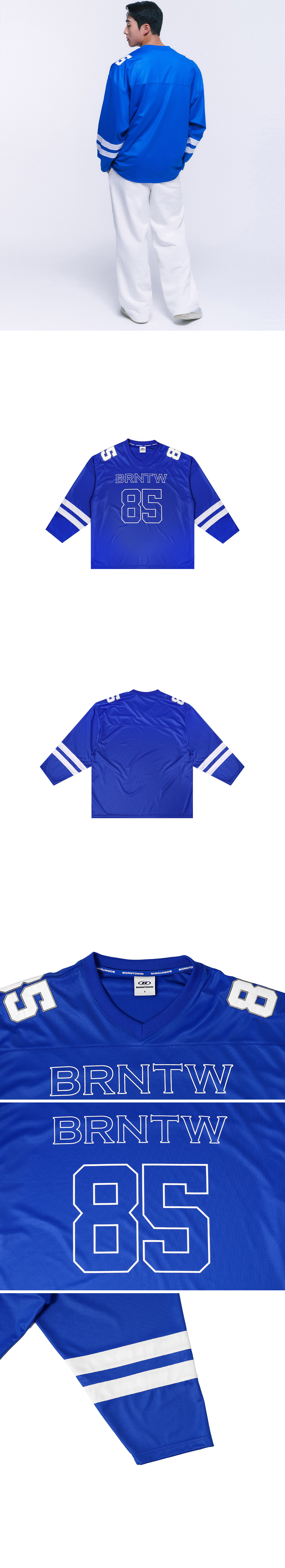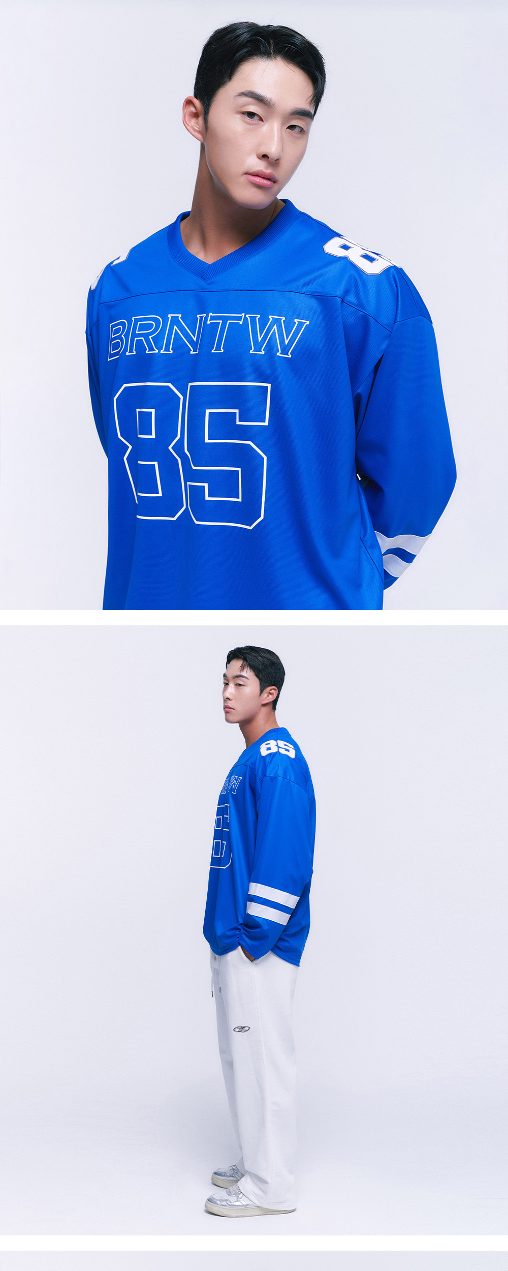 [DETAILS] * BRNTW 85 하키 저지 - 조직감 있는 기능성 원단 - 착용감 좋은 V-NECK LINE - 여유로운 실루엣의 오버 사이즈핏 - 시그니처 그래픽 및 어플리케 자수 포인트 Material : POLYESTER 100% Fitting : BZ 1 Size, 177cm, 86kg / GY 1 Size, 165cm, 53kg