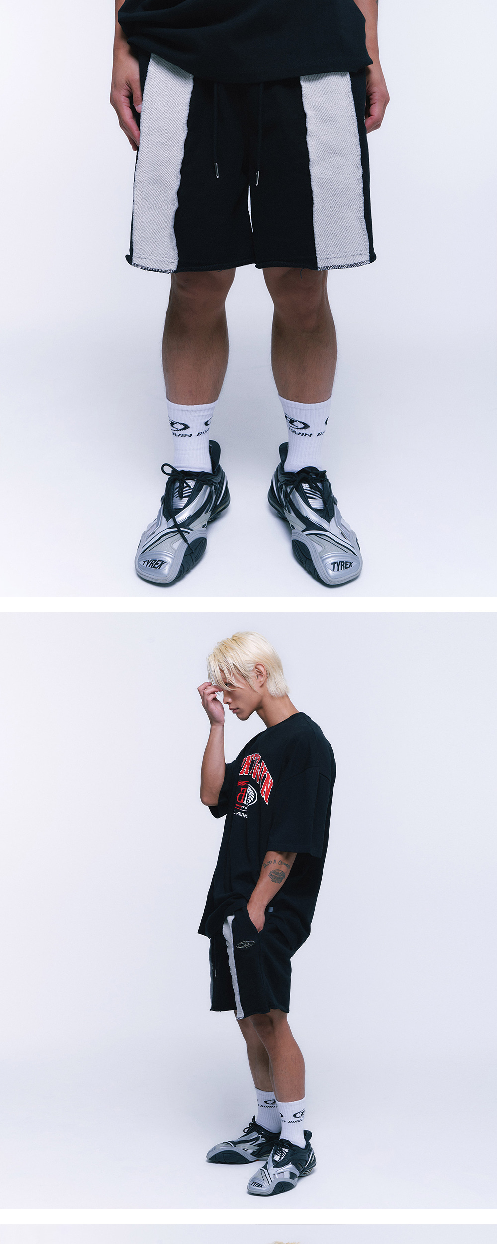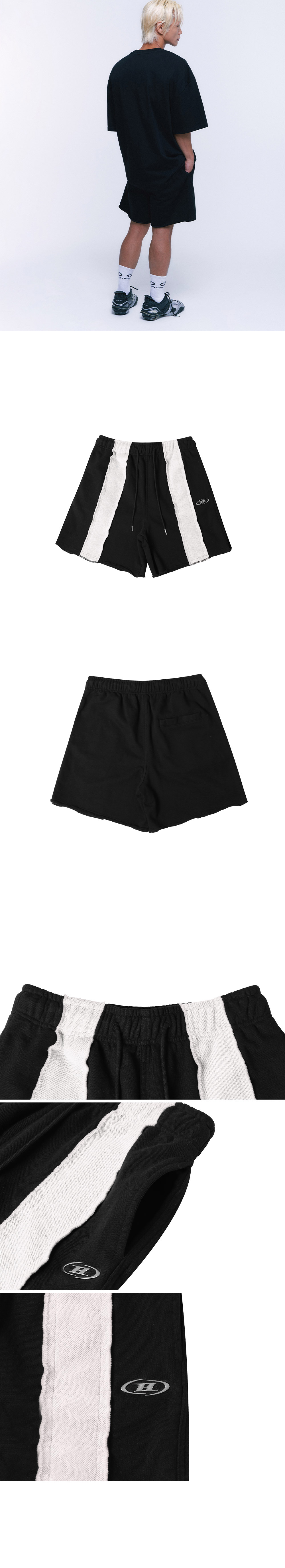 [DETAILS] * 리버스 믹스 하프 팬츠 SHORT VER - 편안한 착용감의 코튼폴리 이중직 원단 - 리버스 믹스 디자인 - 가먼트 워싱으로 자연스러운 올 풀림 포인트 - 활용도 높은 백 포켓 Material : COTTON 100% Fitting : DS 2 Size, 178cm, 70kg / DB 2 Size, 171cm, 57kg