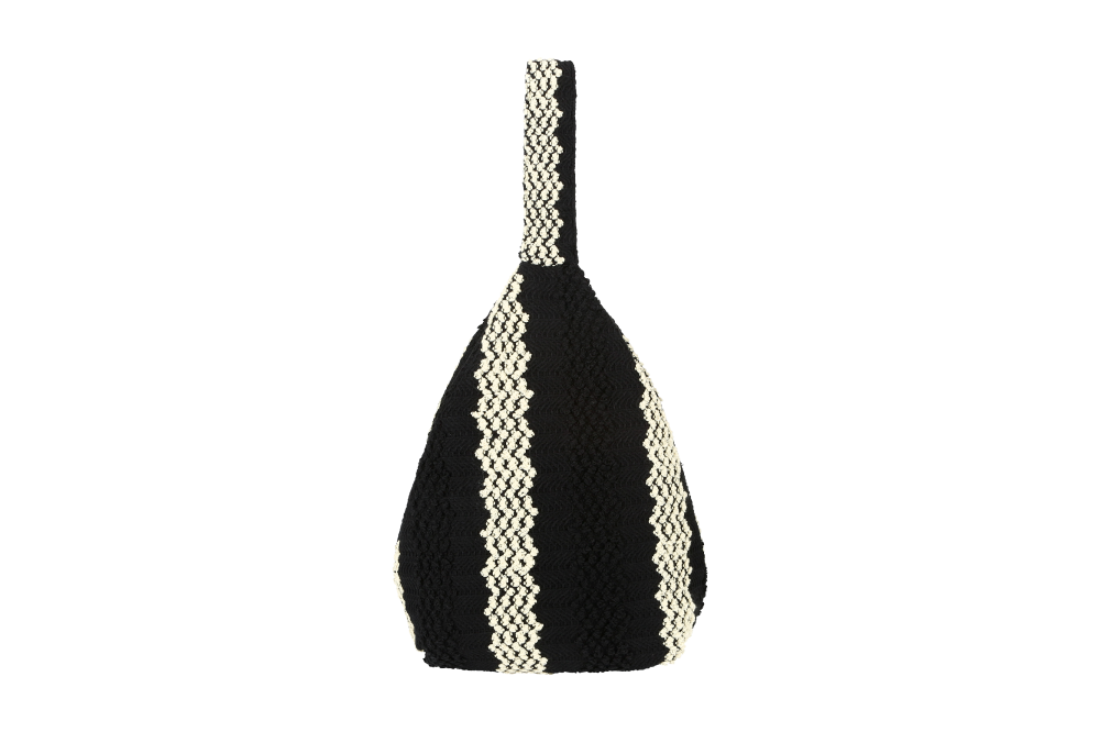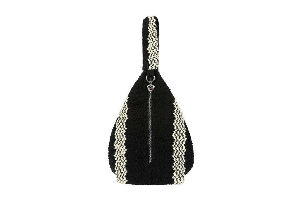 니트 자카드 소재를 활용한 호보 실루엣의 빅 백. · 2개의 섹션으로 나뉜 메인 수납부 · 넓은 폭과 볼드한 스트랩 · 숄더 / 크로스로 연출 가능 · 레더 소재로 마감한 니켈 지퍼 · 시그니처 하트 참과 오픈형 링 장식 · 내부 지퍼 포켓과 가죽 로고 라벨