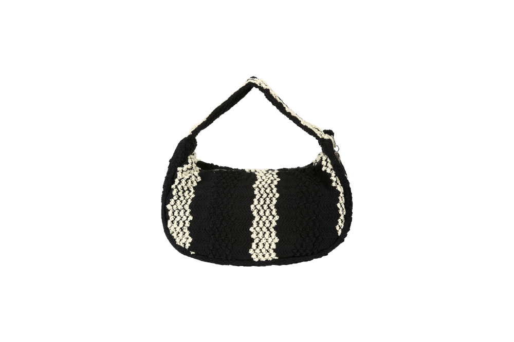 니트 자카드 소재를 활용한 호보 실루엣의 숄더 백. · 넓은 폭과 볼드한 스트랩 · 레더 소재로 마감한 니켈 지퍼 · 시그니처 하트 참과 오픈형 링 장식 · 내부 지퍼 포켓과 가죽 로고 라벨