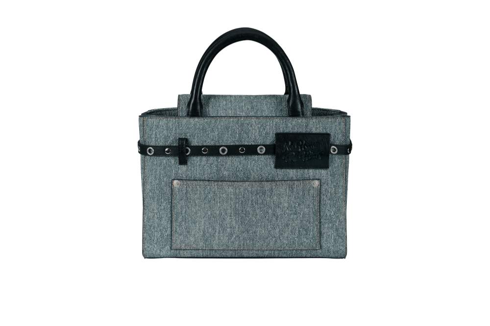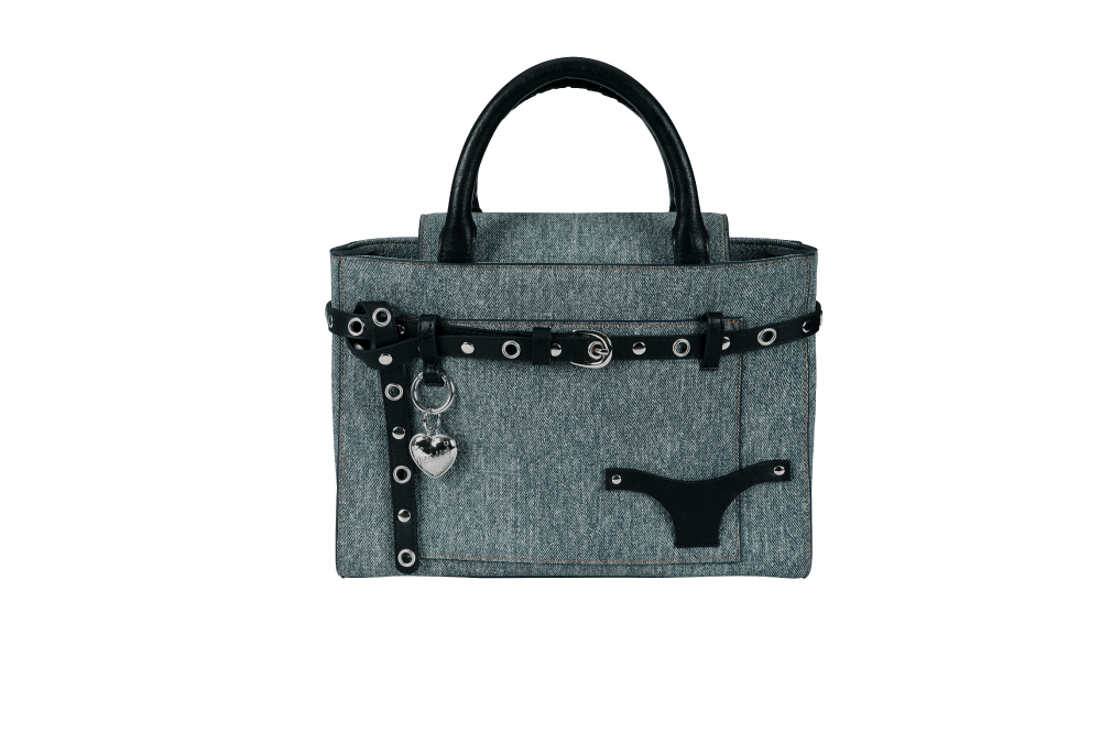 데님 레더 소재의 2way 숄더 백. 진 디자인을 모티프로 배색하고 실버 메탈 장식으로 마감. · 버클 형식으로 폭을 조절하는 메인 수납부 · 스터드와 아일렛으로 장식한 벨트 스트랩 · 부메랑 실루엣의 프론트 카드 포켓 · 시그니처 하트 참과 오픈형 링 · 브레이드 장식이 달린 탑 핸들 · 후면부 진 모티프의 리벳과 레더 패치 · 내부 2개의 섹션으로 나뉜 포켓과 카드 수납용 미니 포켓 · 하단부 스터드 받침