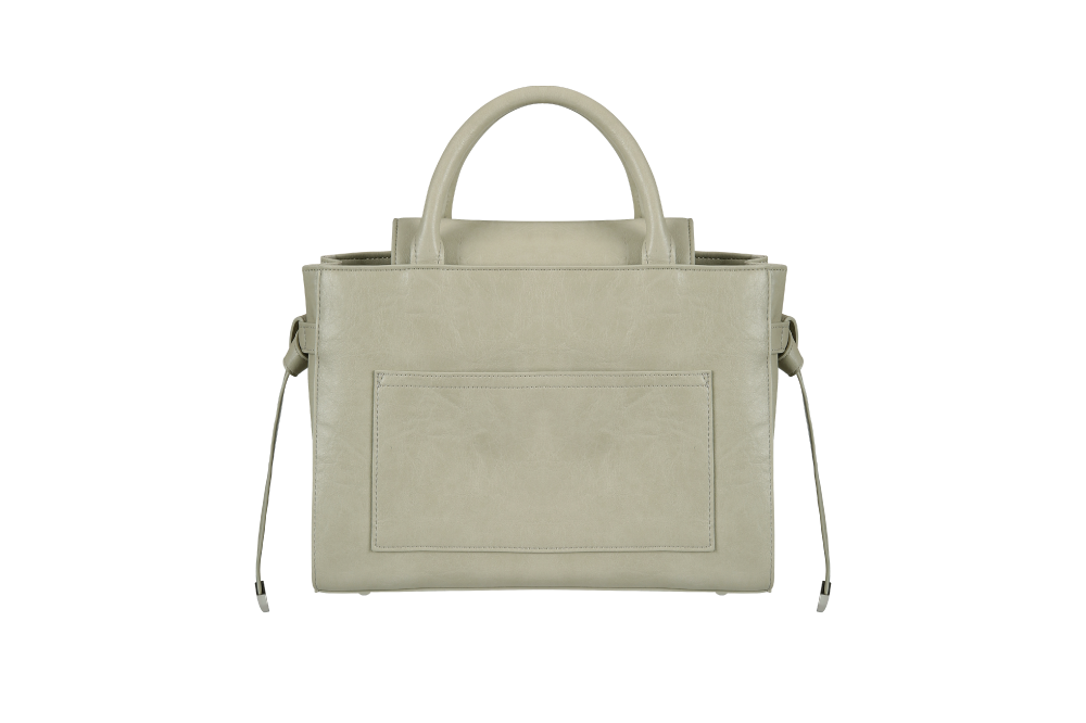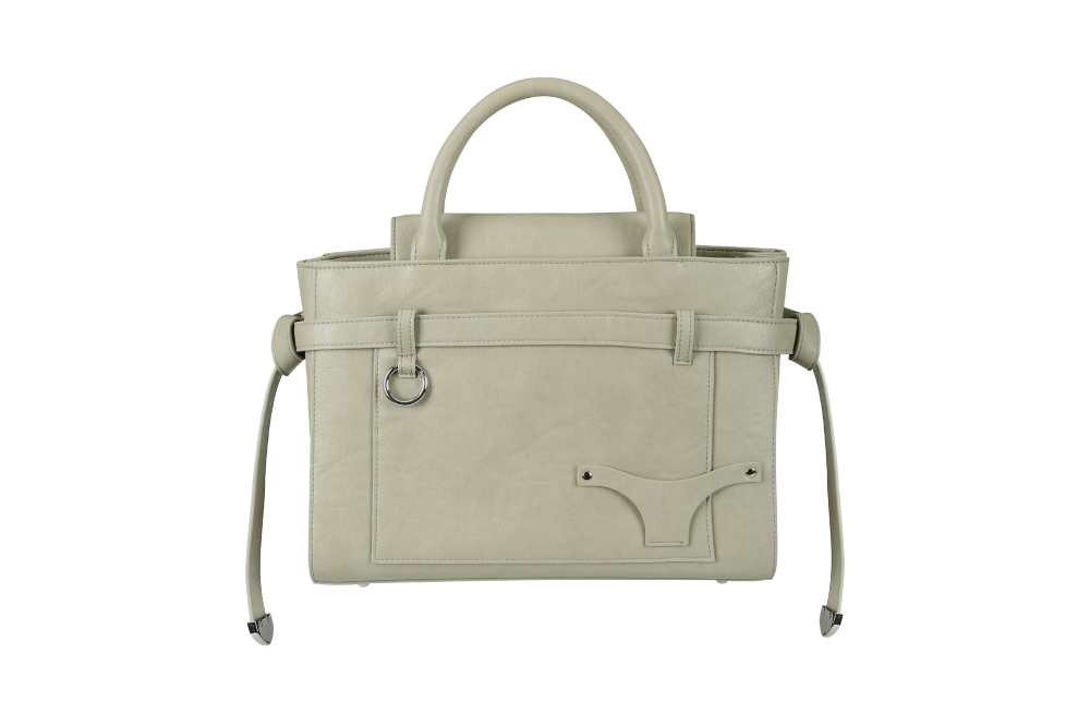 레더 소재의 2way 숄더 백. 타이드 스트랩과 실버 메탈 장식으로 포인트. · 스트랩을 조절해 폭을 변경할 수 있는 메인 수납부 · 실버 장식으로 마감한 타이드 스트랩 · 부메랑 실루엣의 프론트 네임 카드 포켓 · 커스텀할 수 있는 오픈형 실버 링 · 하드한 터치감의 탑 핸들 · 내부 2개의 섹션으로 나뉜 포켓과 카드 수납용 미니 포켓 · 하단부 스터드 받침