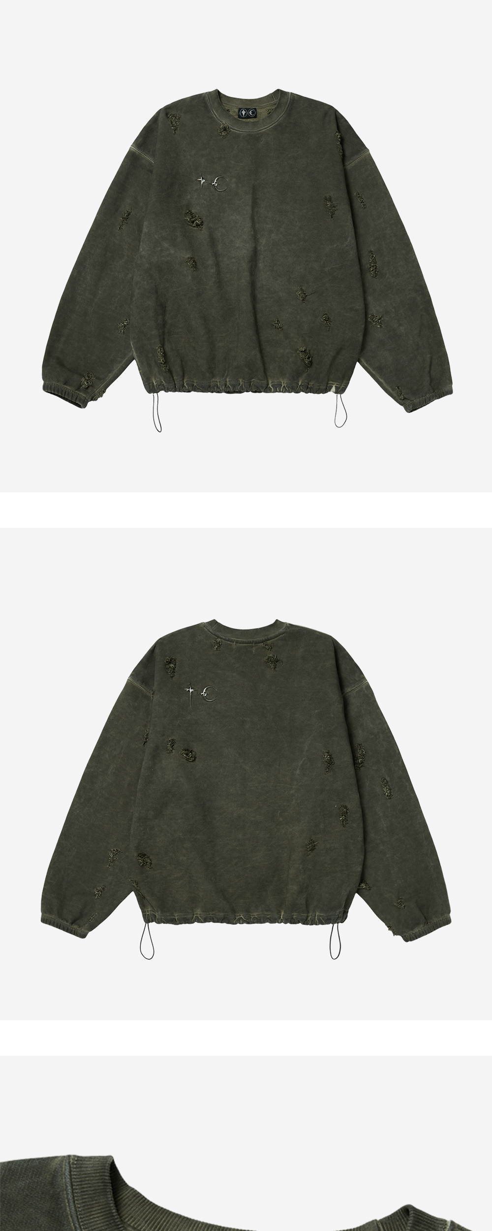 물 빠진 듯한 색감과 데미지 디테일이 빈티지한 느낌을 주는 떠그 클럽의 스웨트셔츠입니다. - 전면 및 후면에 적용된 TC 엠블럼 - 조직감이 큰 헤비 코튼 소재 - 밑단 스트링으로 실루엣 조절 가능 - 데미지 워싱 디테일 - 오버사이즈 핏 * 리벳, 엠블럼이 떨어질 위험이 있어서 건조기 사용 불가하며 손세탁을 권장합니다. * M, L, XL 사이즈는 2, 3, 4 사이즈와 동일합니다.