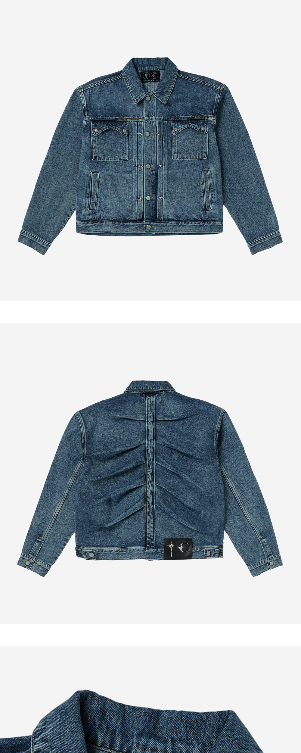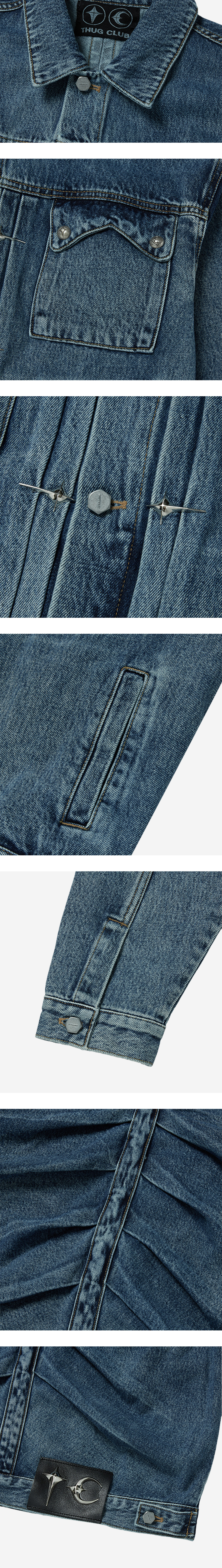 뒷면의 턱 디자인이 골격을 연상시키는 떠그 클럽의 클로우 데님 자켓입니다. - 오버사이즈 핏 - TC 엠블럼 및 리벳 - 후면에 적용된 턱 디테일 - 후면 가죽 패치 및 TC 스터드 - GOB 데님 팬츠와 셋업으로 착용 가능 * 리벳, 엠블럼이 떨어질 위험이 있어서 건조기 사용 불가하며 손세탁을 권장합니다. * M, L, XL 사이즈는 2, 3, 4 사이즈와 동일합니다.