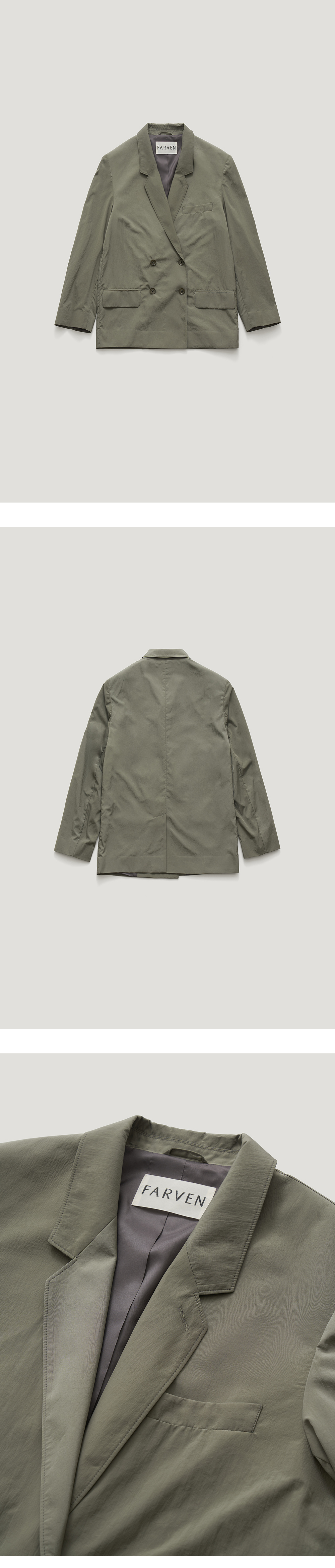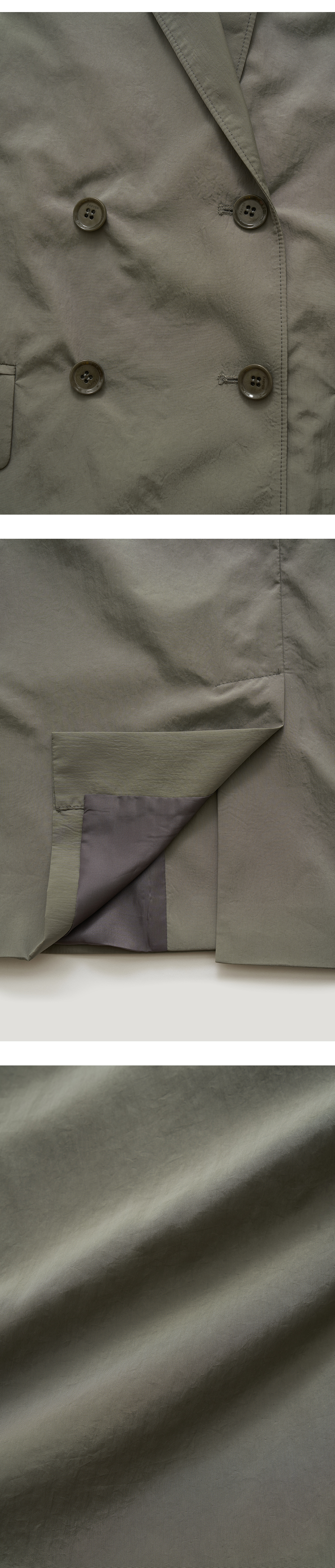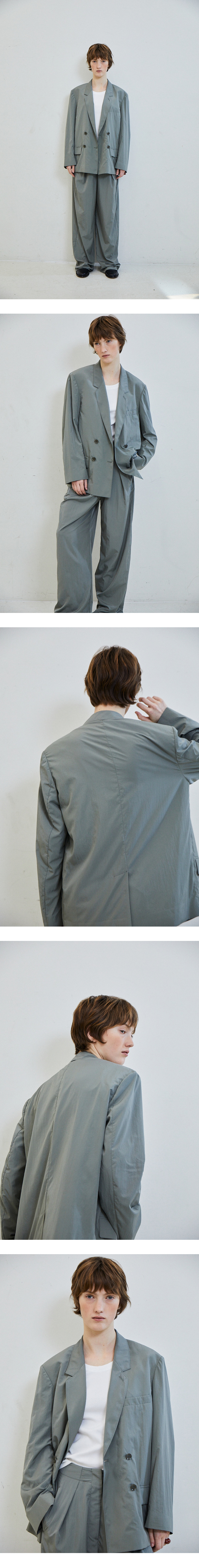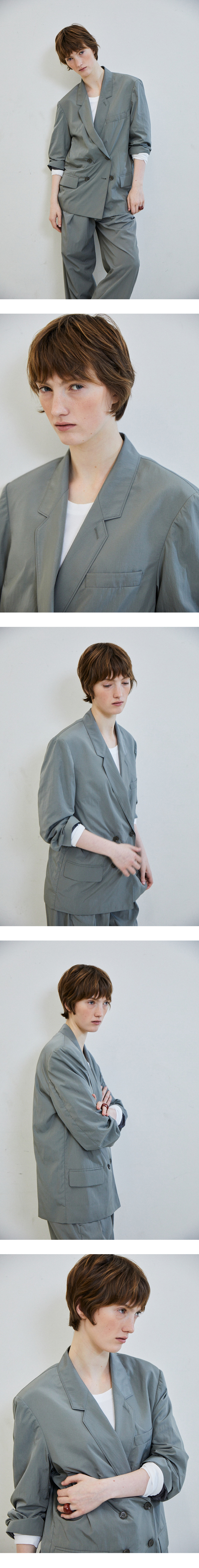 [배송 안내] *해당 상품은 10/4부터 순차적으로 배송되는 상품입니다. 나일론 소재의 가벼운 텍스처가 매력적인 더블자켓입니다. 원단 자체에 자연 스러운 주름이 있어 착용 시 구김 신경이 덜 가며 여유 있는 핏으로 편안하게 착용하기 좋습니다. 로고가 각인된 버튼과 내구성 좋은 안감으로 마무리했으 며 적당한 두께감으로 활용도가 높은 아이템입니다. WALTER PIN-TUCK SLA CKS과 셋업으로 착용 가능합니다.