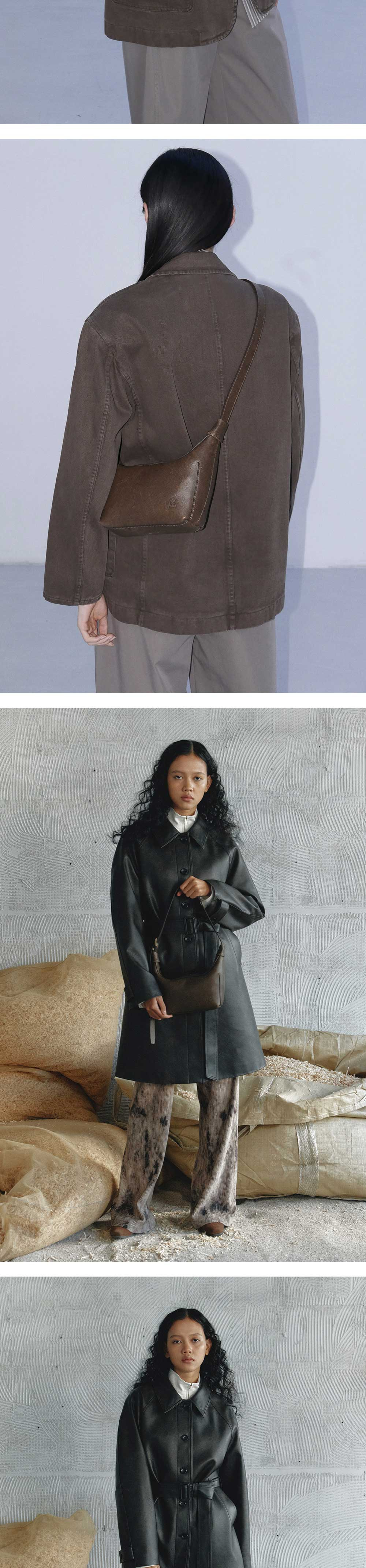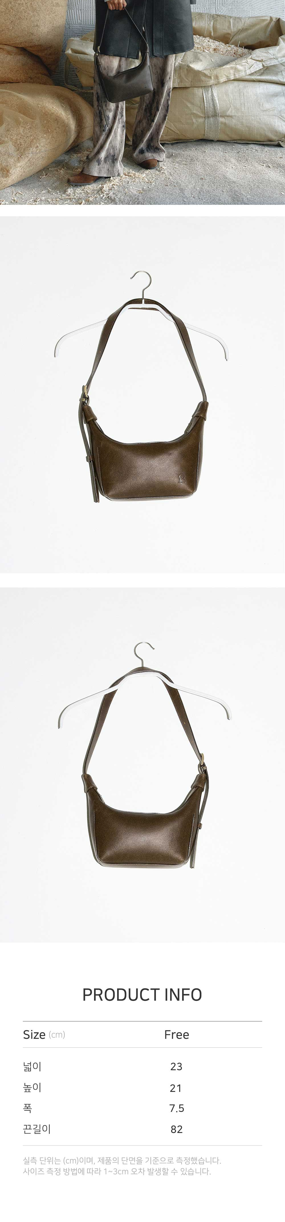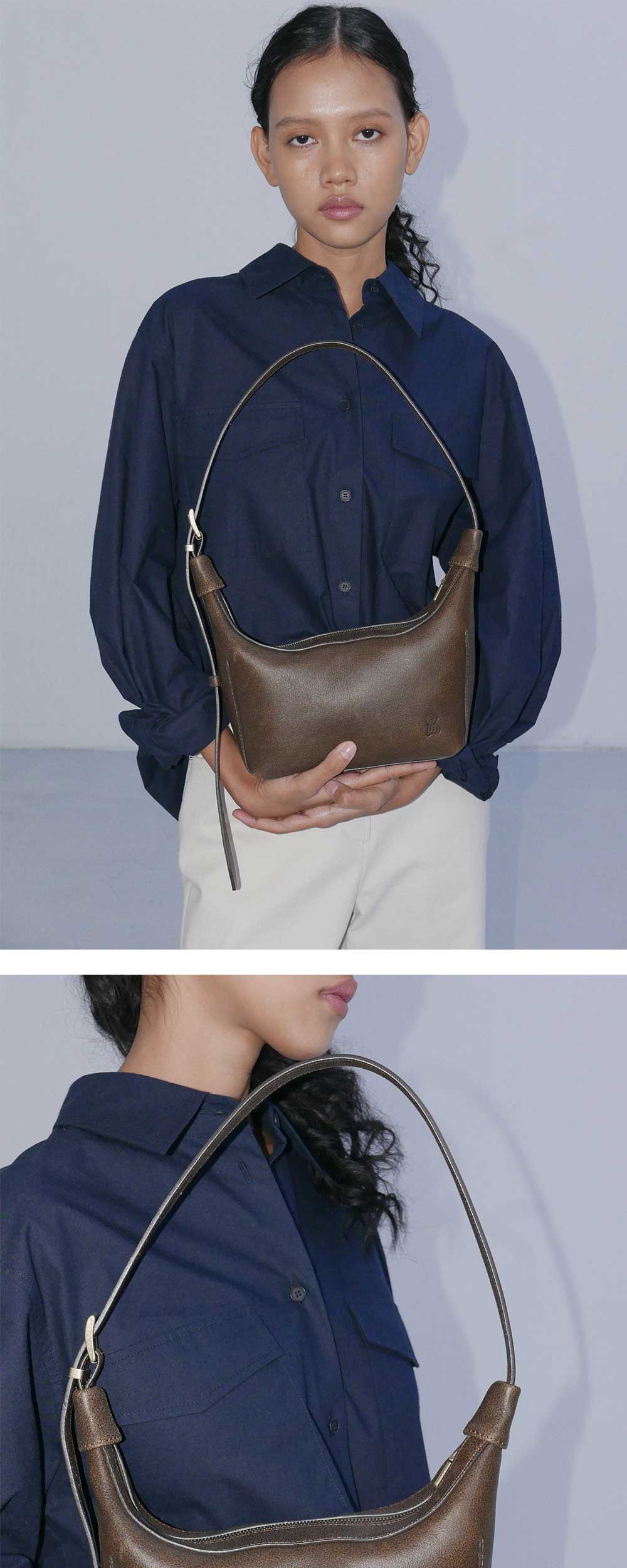 - 등변 사다리꼴의 실루엣과 매트한 질감, 그리고 자연스러운 크랙 텍스처가 매력적인 100% 소가죽 소재로 제작된 숄더백입니다. - 미니멀한 디자인과 적당한 스트랩 길이로 편안하게 숄더 형태로 착용이 가능하며 7개의 벨트 구멍을 넣어 착용자의 사이즈에 맞게 조절이 가능합니다. - 윗창과 밑창의 보강 작업을 하여 긴 다트 디테일로 견고하고 탄탄한 실루엣을 유지합니다. - 이너 포켓으로 다양한 수납이 가능하여 활용성이 높으며 하단의 엔오르 심볼 로고 불박 디테일로 완성도를 높였습니다.