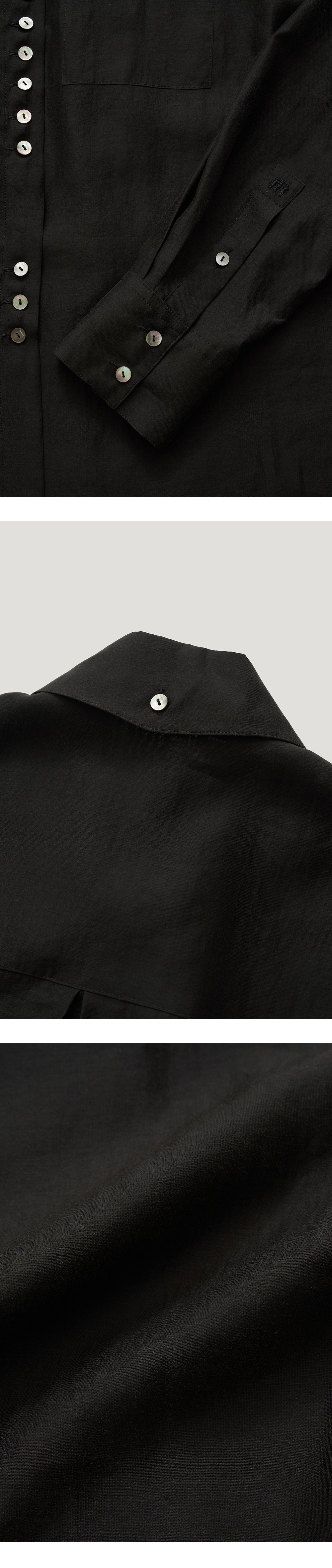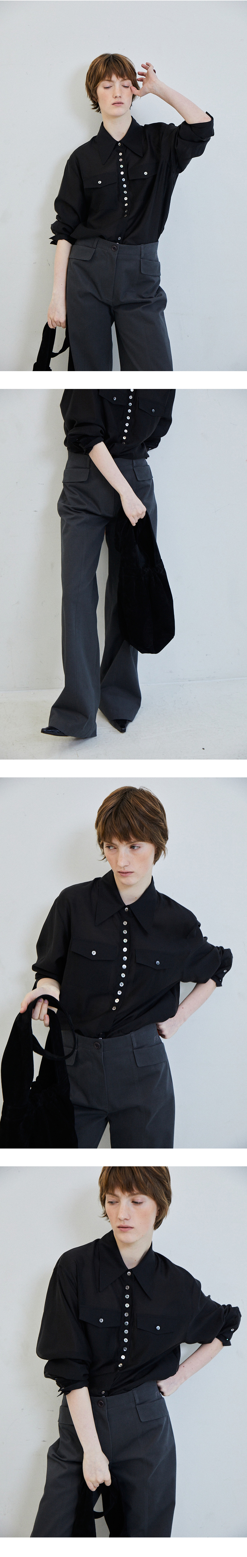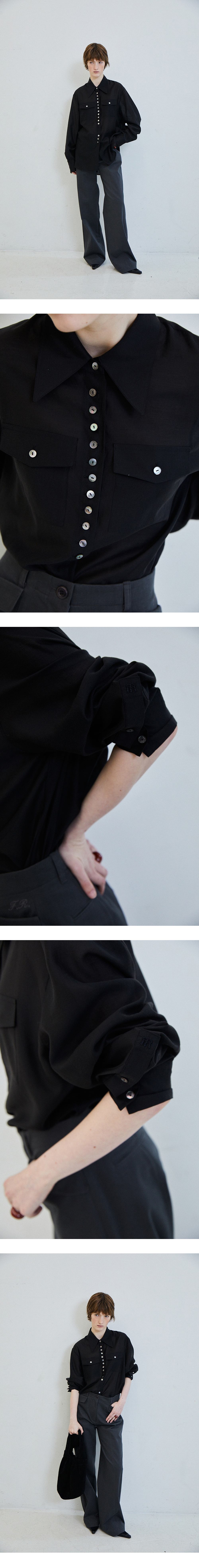 [배송 안내] *해당 상품은 10/4부터 순차적으로 배송되는 상품입니다. 은은한 광택감과 흐르는 텍스쳐가 돋보이는 블라우스입니다. 힙라인까지 덮어 주는 기장감과 스탠다드한 실루엣으로 클래식하게 활용 가능하며 리얼 자개단추 여밈 구조로 마무리 하였습니다. 뒷 넥 중앙에 자개단추와 소매 심볼 십자수자수 로 포인트를 주었고 PEANUT PLEATS SKIRT와 셋업으로 착용 가능합니다.