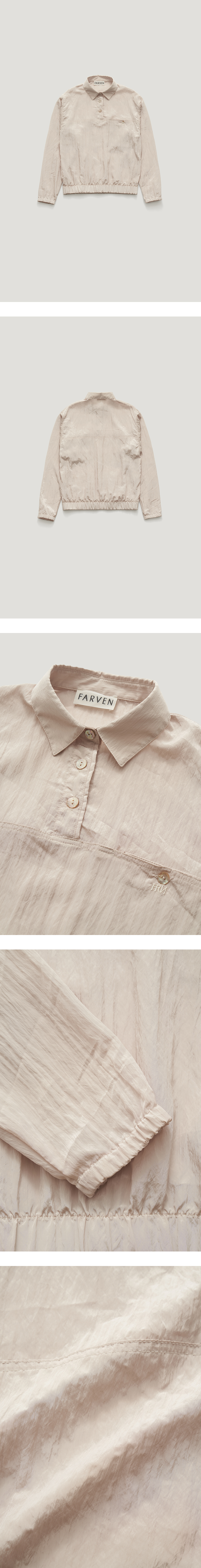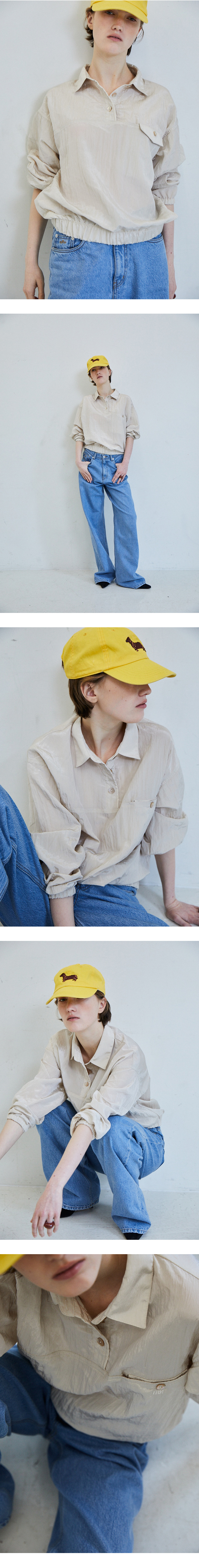 [배송 안내] *해당 상품은 10/4부터 순차적으로 배송되는 상품입니다. 은은한 광택감이 도는 부드러운 소재의 캐주얼한 카라셔츠입니다. 사계절 모두 착용이 가능한 두께감으로 자연스러운 실루엣과 함께 소매와 밑단에 스트링을 사용하여 편안한 착용감을 느낄 수 있습니다. 왼쪽가슴포켓에 로고자수와 버튼디테일을 통해 다양한 연출이 가능합니다.