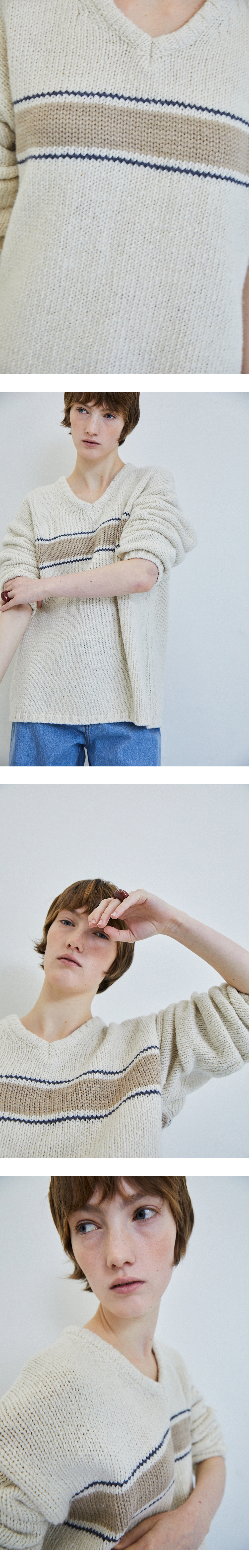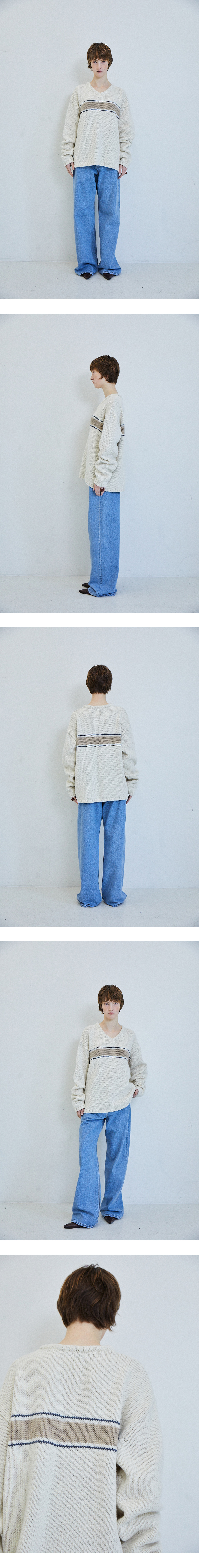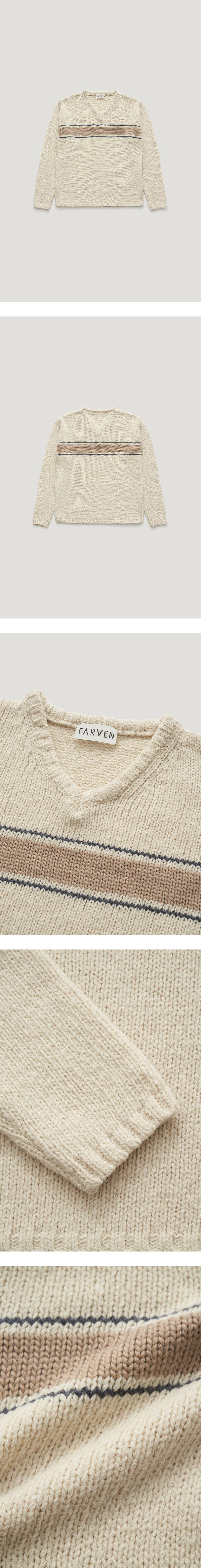 [배송 안내] *해당 상품은 10/4부터 순차적으로 배송되는 상품입니다. 차분한 톤에 포인트로 배색된 스트라이프가 돋보이는 적당한 깊이감의 V 넥 풀오버입니다. 울 혼방 원사로 거친 표면을 표현하기 위해 최소한의 가공으로 양모 원사를 만들었습니다. 이너와 함게 착용하기 좋은 여유로운 실루엣이며 소매와 밑단 그리고 넥 라인의 굵게 짜인 탄탄한 립 조직으로 형태감을 잡아주었습니다.